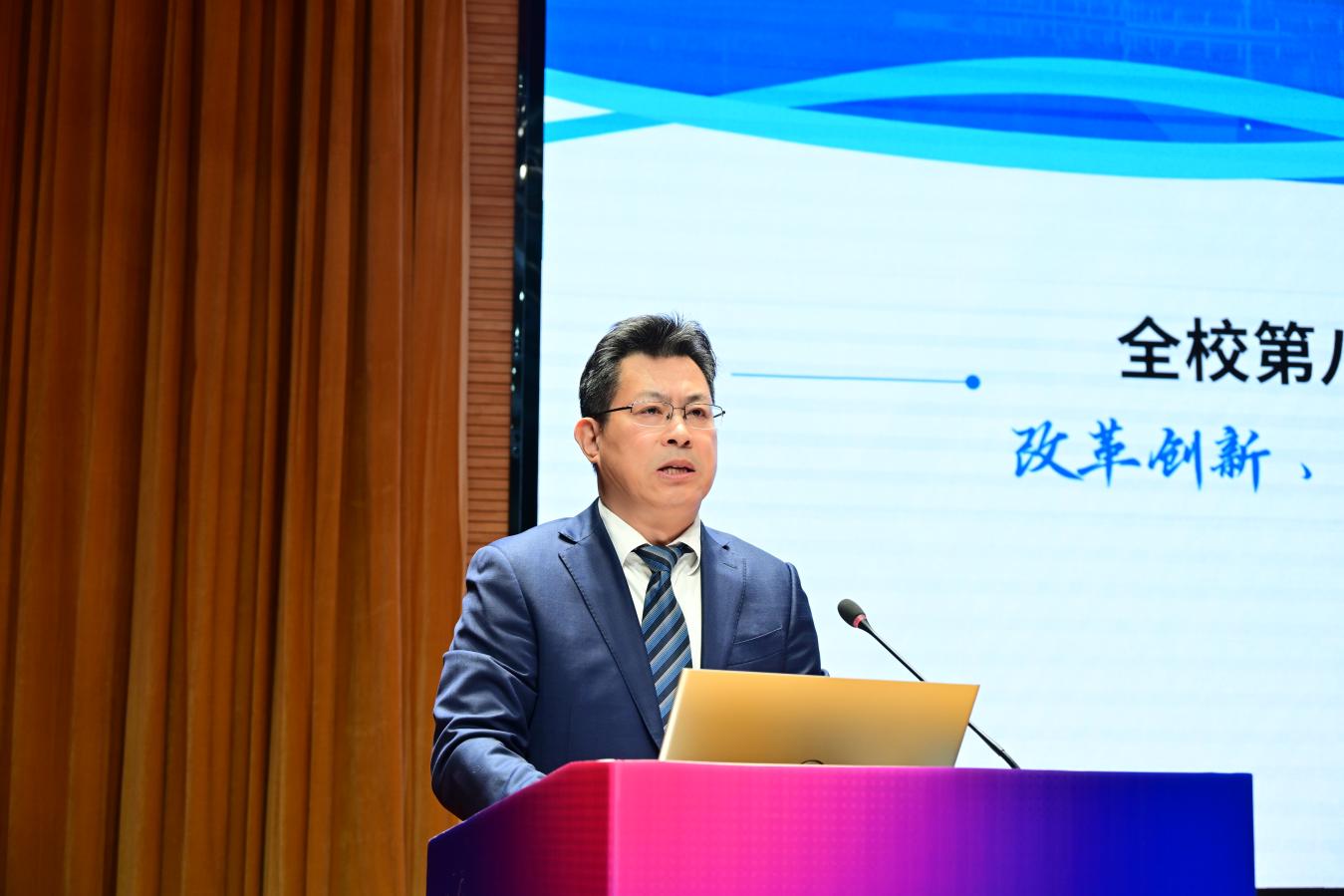黄飞以《抢抓机遇 深化改革 全面开创本科教育教学高质量发展新局面》为题作本科教学工作报告。他全面回顾总结了第八次本科教学工作会议以来,学校在落实立德树人根本任务、深化教育教学改革创新、提高应用型人才培养质量等方面取得的进展和成效。从国家发展战略、高等教育发展趋势、区域发展需求、学校自身发展等方面,深入分析了学校改革发展面临的机遇挑战和教育教学工作中存在的突出问题,全面部署了下一步以深化改革助推高质量本科教育教学体系建设工作。