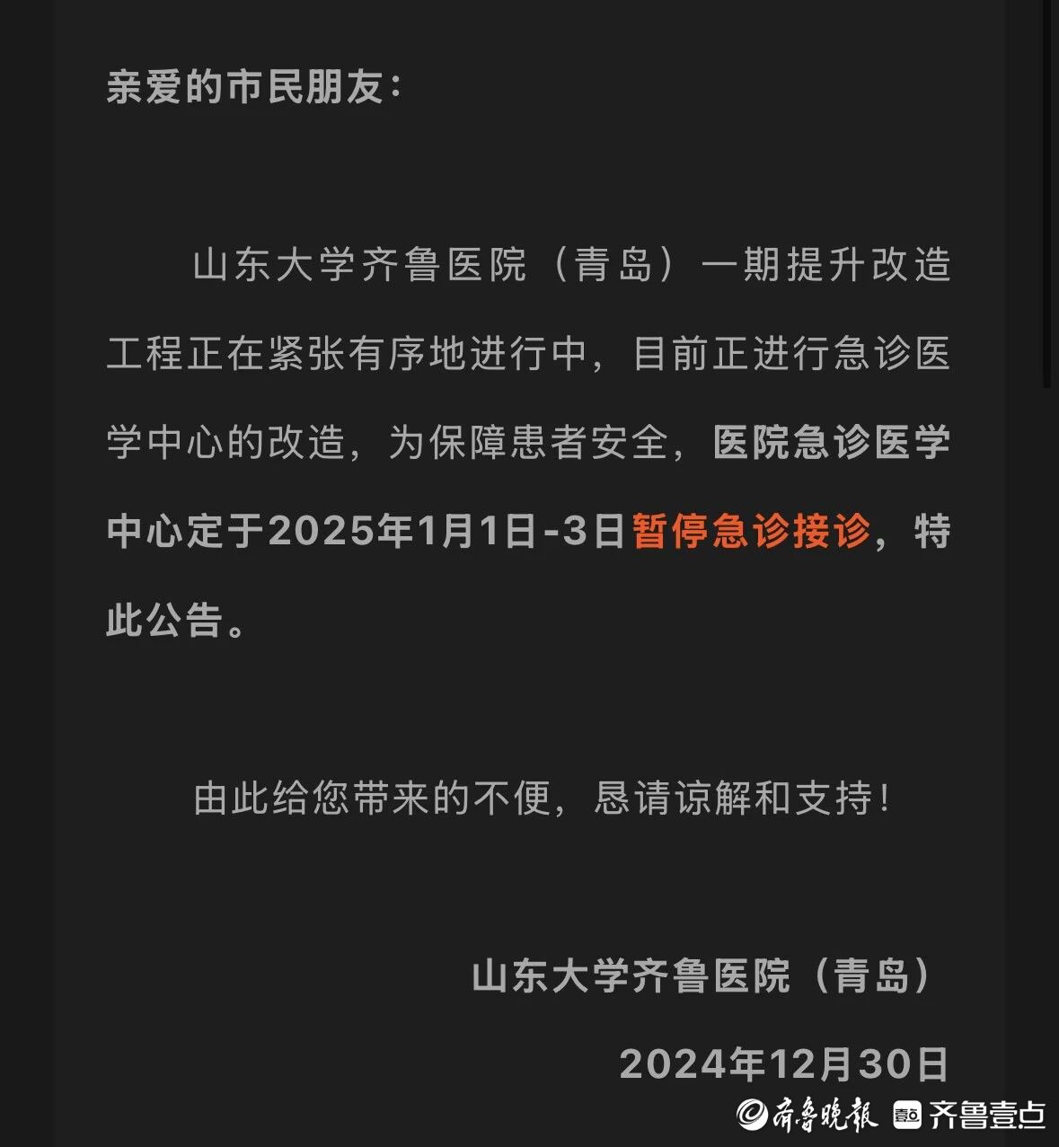 齐鲁晚报·齐鲁壹点 刁明杰 日前,山东大学齐鲁医院(青岛)发布提示,医院一期提升改造工程正在紧张有序地进行中,目前正进行急诊医学中心的改造,为保障患者安全,医院急诊医学中心定于2025年1月1日-3日暂停急诊接诊。