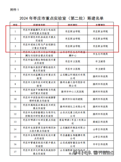 近日,枣庄市科学技术局印发《关于批准2024年枣庄市重点实验室(第二批)筹建的通知》,由枣庄职业学院牵头申报的“枣庄市新能源汽车动力电池技术研究重点实验室”“枣庄市绿色有机合成技术重点实验室”“枣庄市逆向工程与产品创新设计重点实验室”获批筹建。