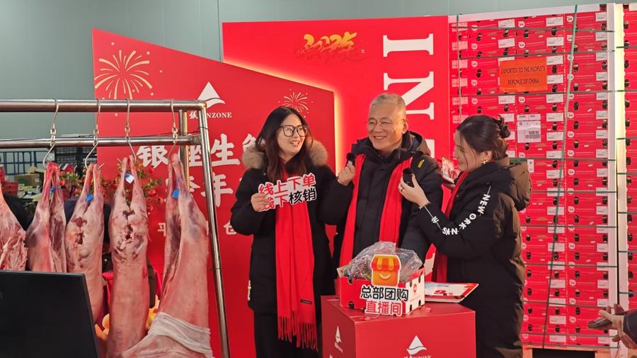 一人多高的车厘子墙、整只白条羊、优选的新鲜水果蔬菜等三十余款生鲜商品通过百余名主播的直播镜头展现给屏幕前的消费者,广大网友不仅可以沉浸式观看、选购、下单,还可选择到店自提、即时配送、快递到家等多种送货方式。各直播间中,鲁商好品、直播好券、新年钜惠……不间断放送,更有银座集团党委委员、副总经理程晓勇亲临直播间带来惊喜价格,用实实在在的节日福利,让消费者在迎接2025年的同时尽情买买买。