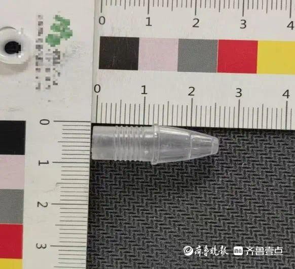 刘艳丽和儿内科周士英副主任医师共同认为,笔嘴较大,并且在气道内嵌合紧密,需做好充分的手术预案和应急措施。随后,刘艳丽联系了麻醉科和内镜中心,相关人员经过充分术前讨论和准备,于1月2日上午9点,在喉罩麻醉下为妮妮进行了支气管镜探查及异物取出术。得益于术前的准备充分,操作人员使用直径2毫米异物钳、从笔嘴下面2毫米左右的缝隙入手,将坎顿紧密、几乎不留缝隙的笔嘴完整取出,整个操作过程不到10分钟。经过测量,笔嘴竟长达2.5cm,最宽处直径1cm。
