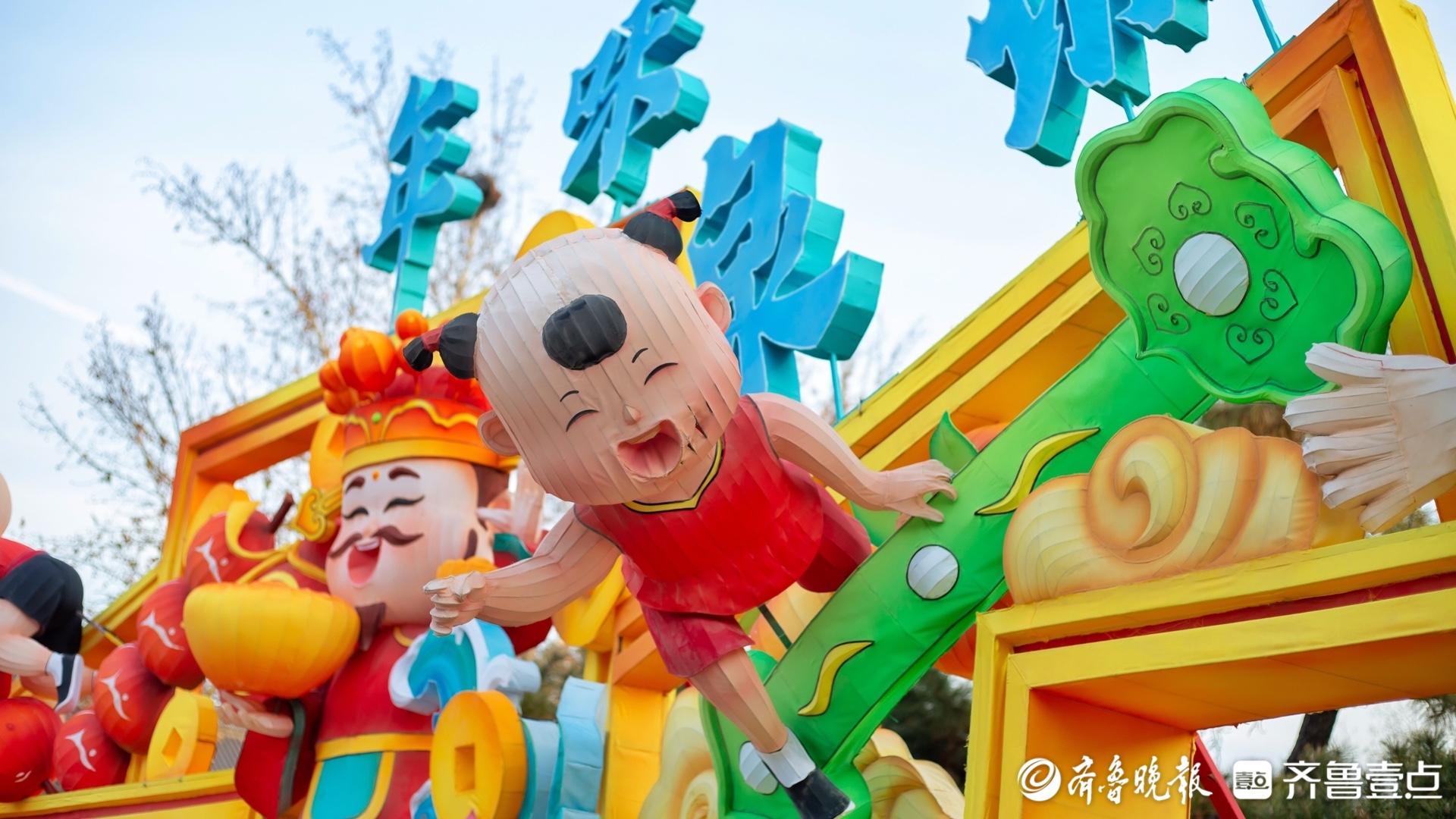 最吸睛的是一群活泼可爱的年画娃娃,与各元素巧妙组合,演绎着庆贺新年的不同场景:有的抱着巨型糖葫芦,尽显顽皮;有的手持小锤,作势击鼓;还有的骑着舞狮,笑容灿烂;更有的乘锦鲤于泉水浪花上嬉戏……每组画面都灵动鲜活,喜庆氛围扑面而来。
