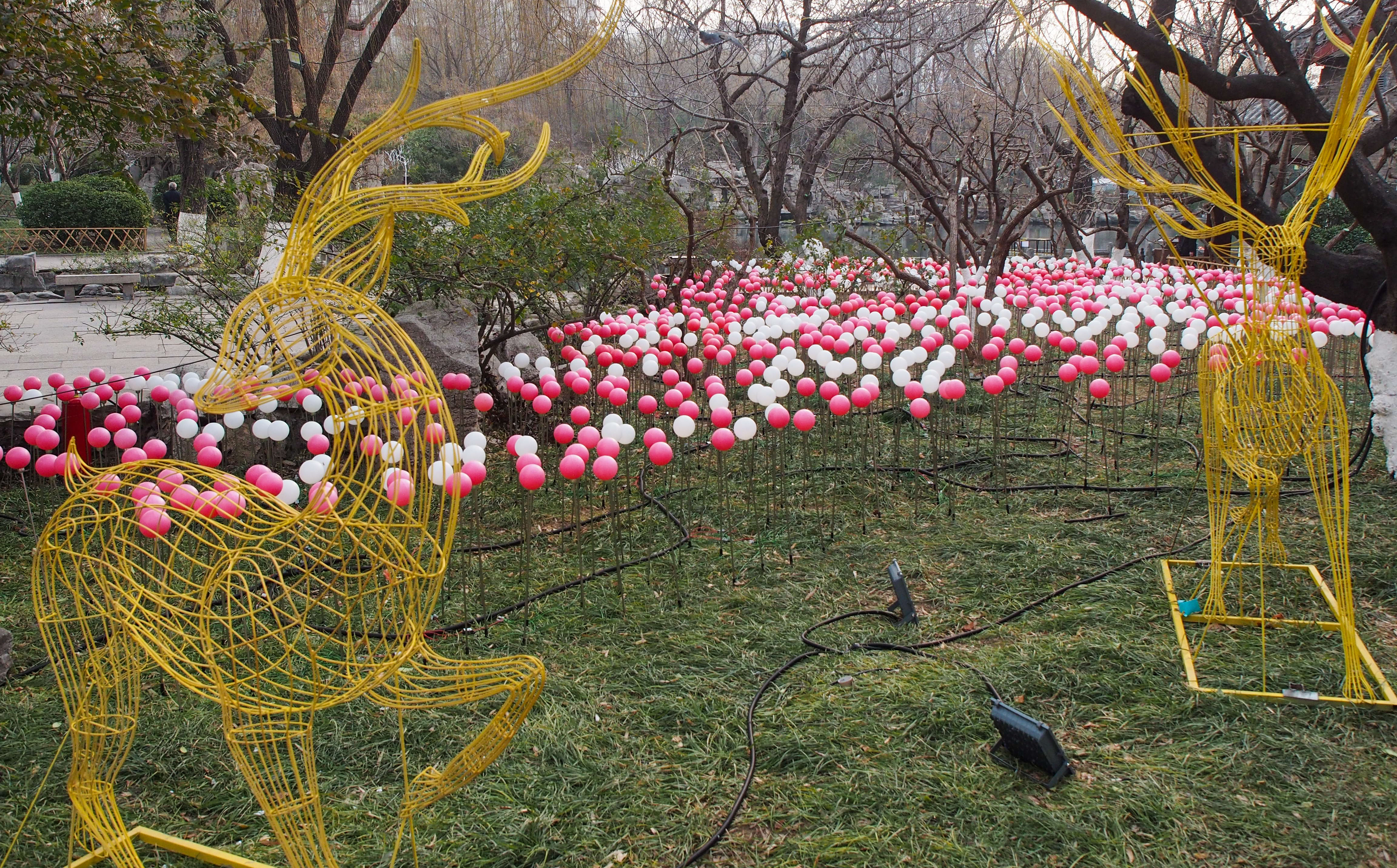 腊月二十三日,济南五龙潭景区,工人们在安装调试大面积的彩灯阵列。