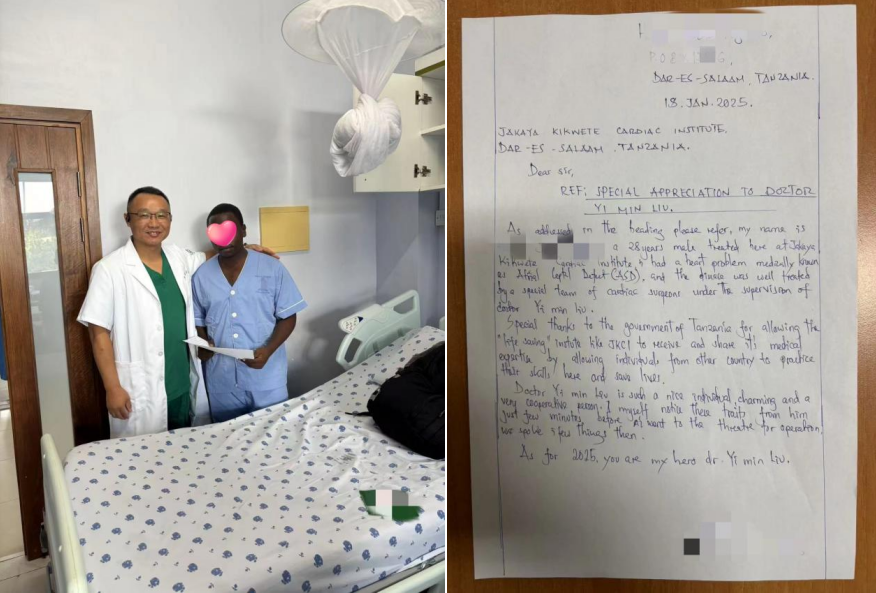 原来这位28岁的小伙儿因房间隔缺损疾病在坦桑尼亚JKCI(Jakaya Kikwete Cardiac Institute)医院就诊,其间得到了刘义敏医生的全力救治。小伙儿在感谢信中说,非常感谢坦桑尼亚政府批准像JCKI这样“拯救生命”的医疗机构接收其他国家的援助医生,让他们在此执业并分享医疗经验,从而挽救了许多生命。刘义敏医生是一位非常优秀、富有人格魅力且懂得团队协作的人。我在术前与他进行了交谈,短短几分钟的时间我便感受到了他的这些特质。2025年,刘义敏医生就是我的英雄。