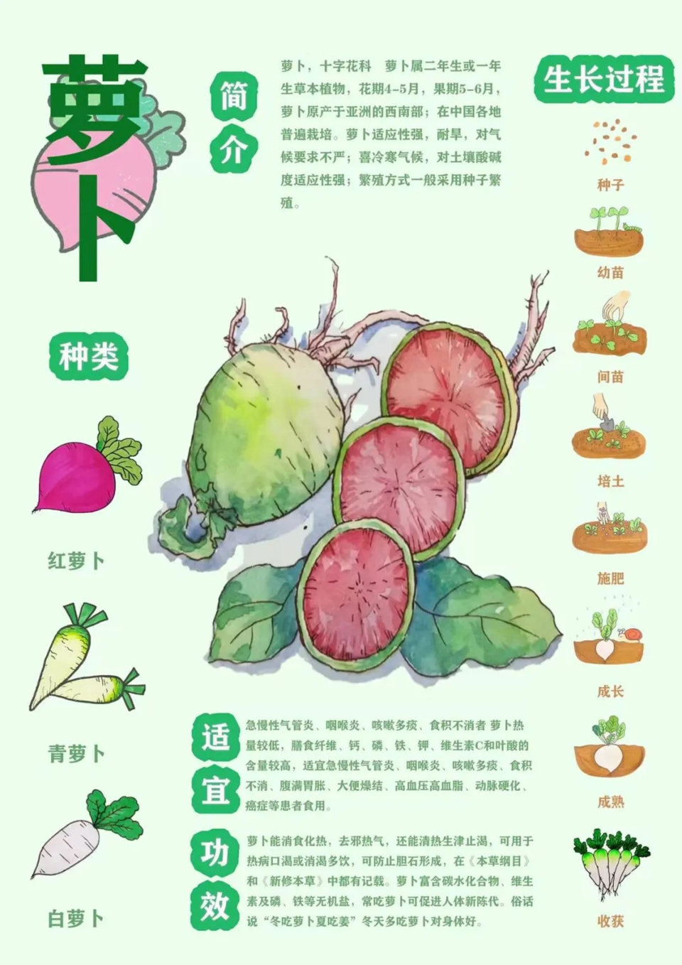 《图解萝卜》列举了三种具有代表性的萝卜种类。萝卜对于适宜的人群有很多的功效,萝卜从播种等其他过程最后再到收获的过程采用直观的插画,形象地展现出萝卜的生长过程。
