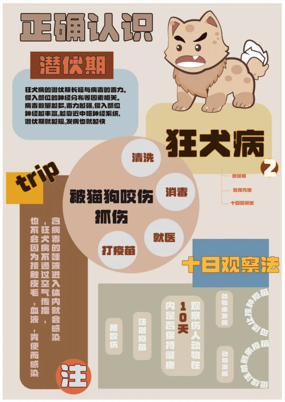 《狂犬病的知识科普》系列海报以“认识狂犬病”为主题,将动物的动画形象与文字结合,通过图文并茂的方式科普“狂犬病”的症状,治疗方式,防御措施等,引起在日常生活中人们对“狂犬病”的重视,从而降低对“狂犬病”的恐惧,减少对“狂犬病”的误解,建立正确的认知体系从而与其和谐相处。
