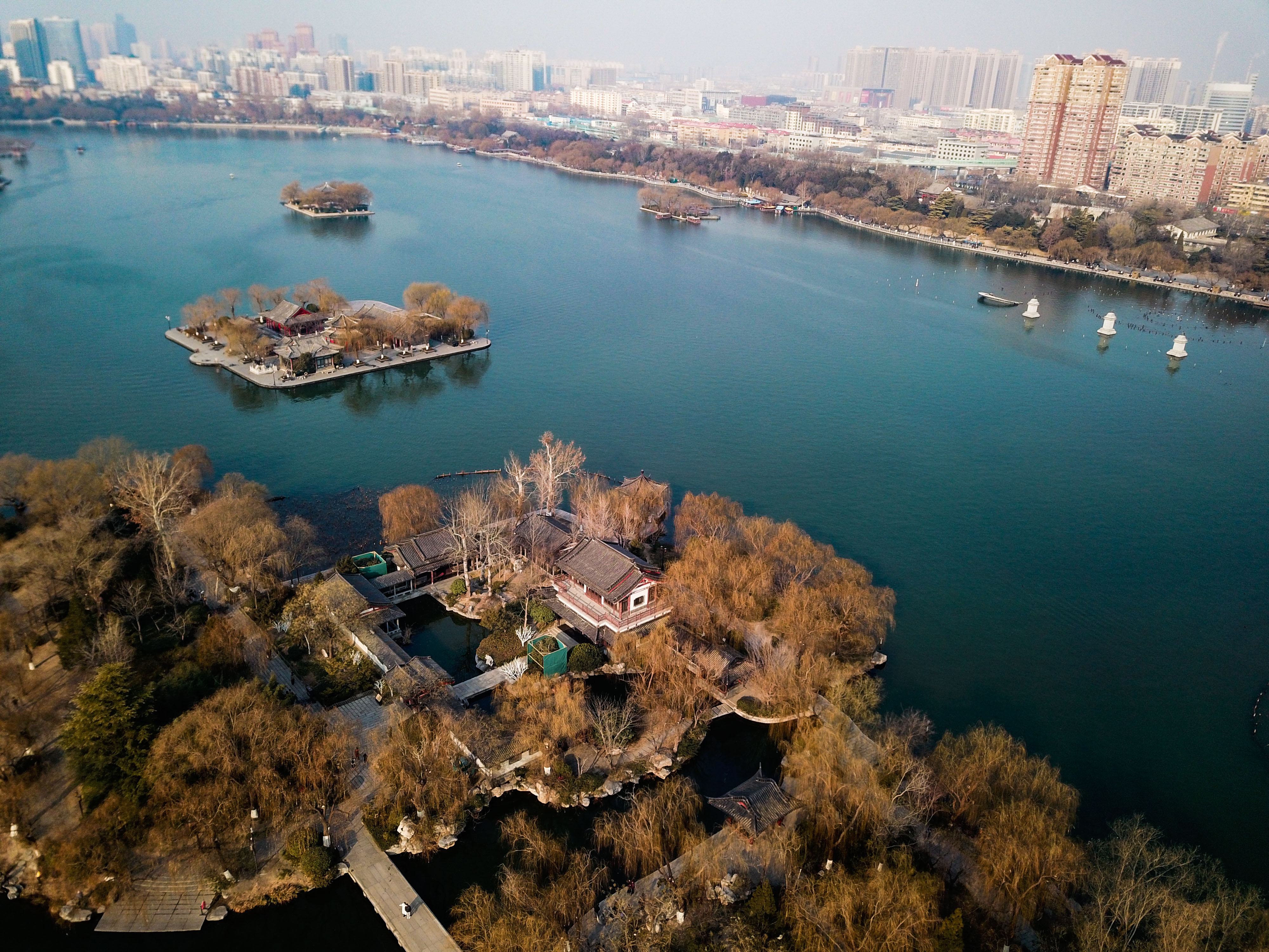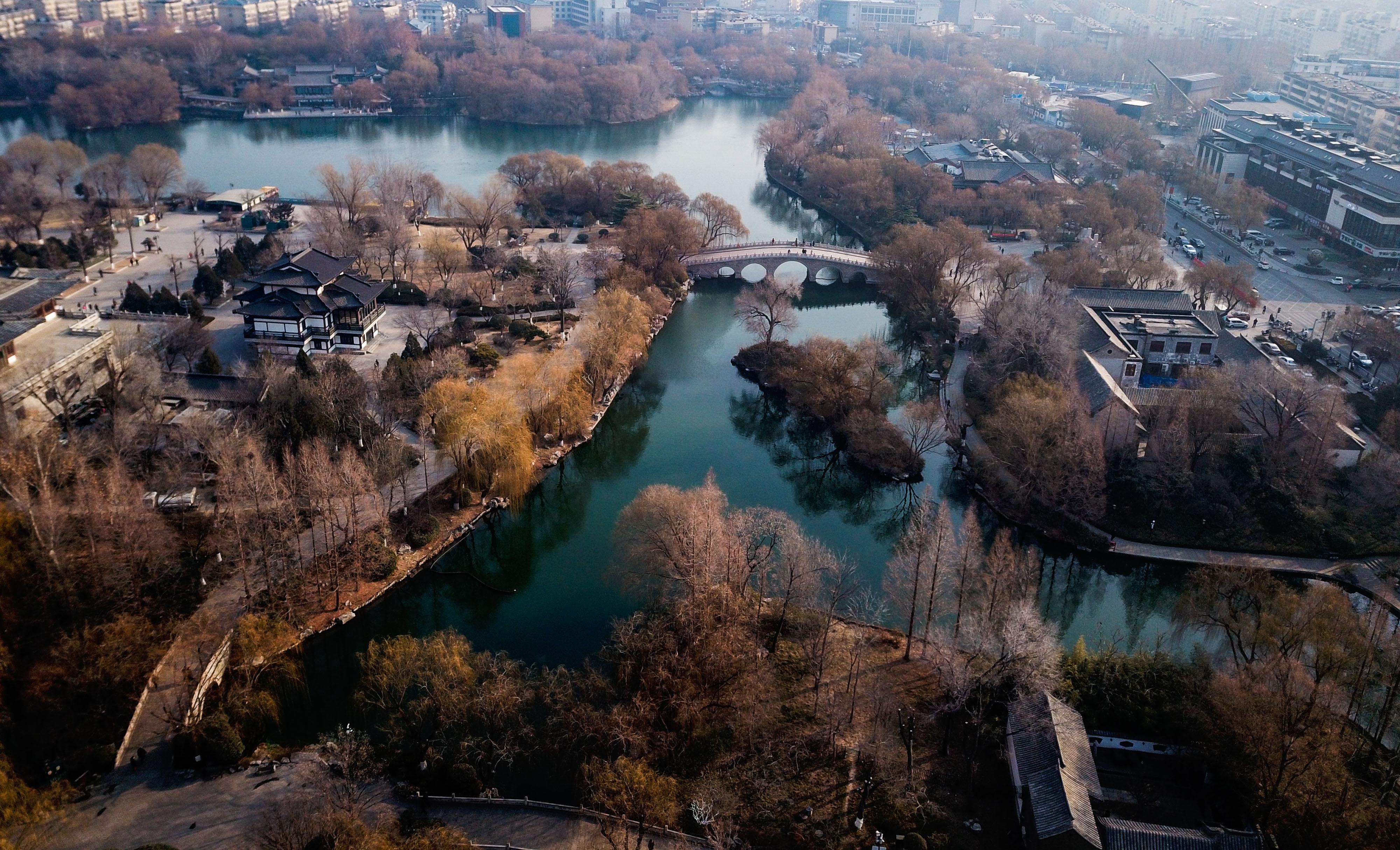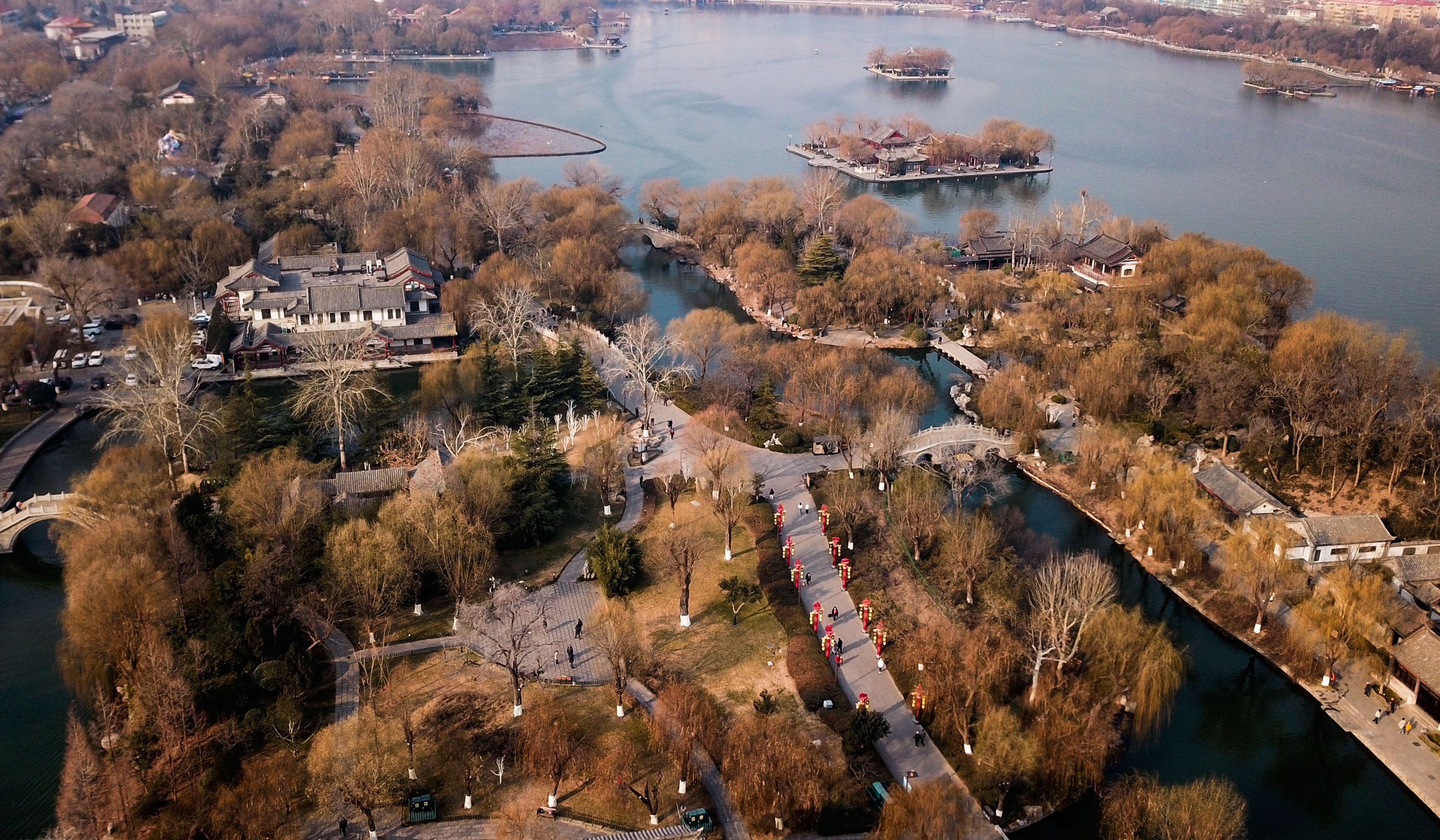 齐鲁晚报·齐鲁壹点记者 周青先 春节假日,航拍冬末的济南大明湖景区。沉静的蓝色湖面上,不时有水鸟缓缓飞过。湖岸边的树林呈现出红棕色,俯瞰犹如一幅设色水墨画。 立春季节已到,虽然济南的天气还冷,但大明湖的生命力正在孕育萌发。