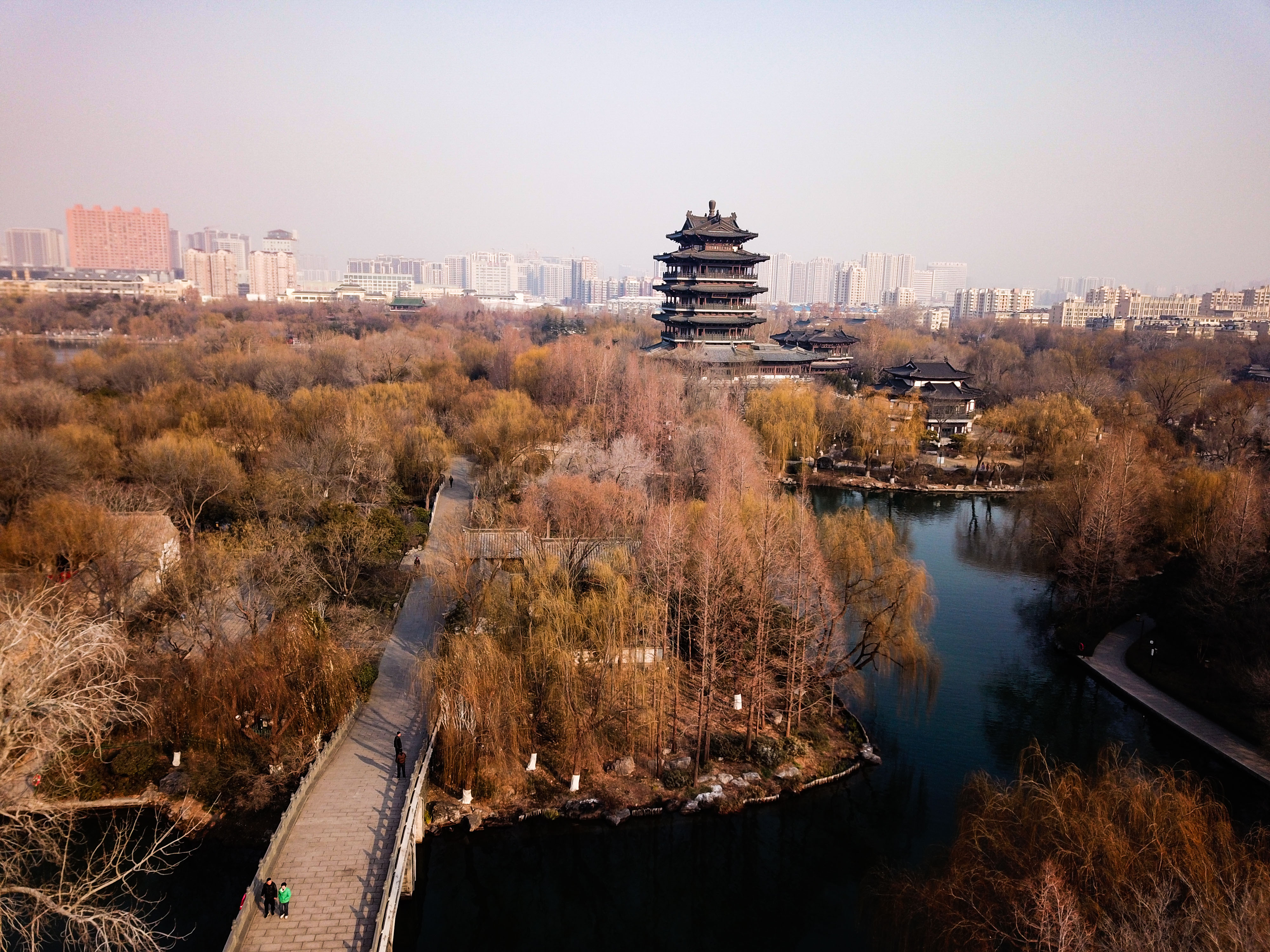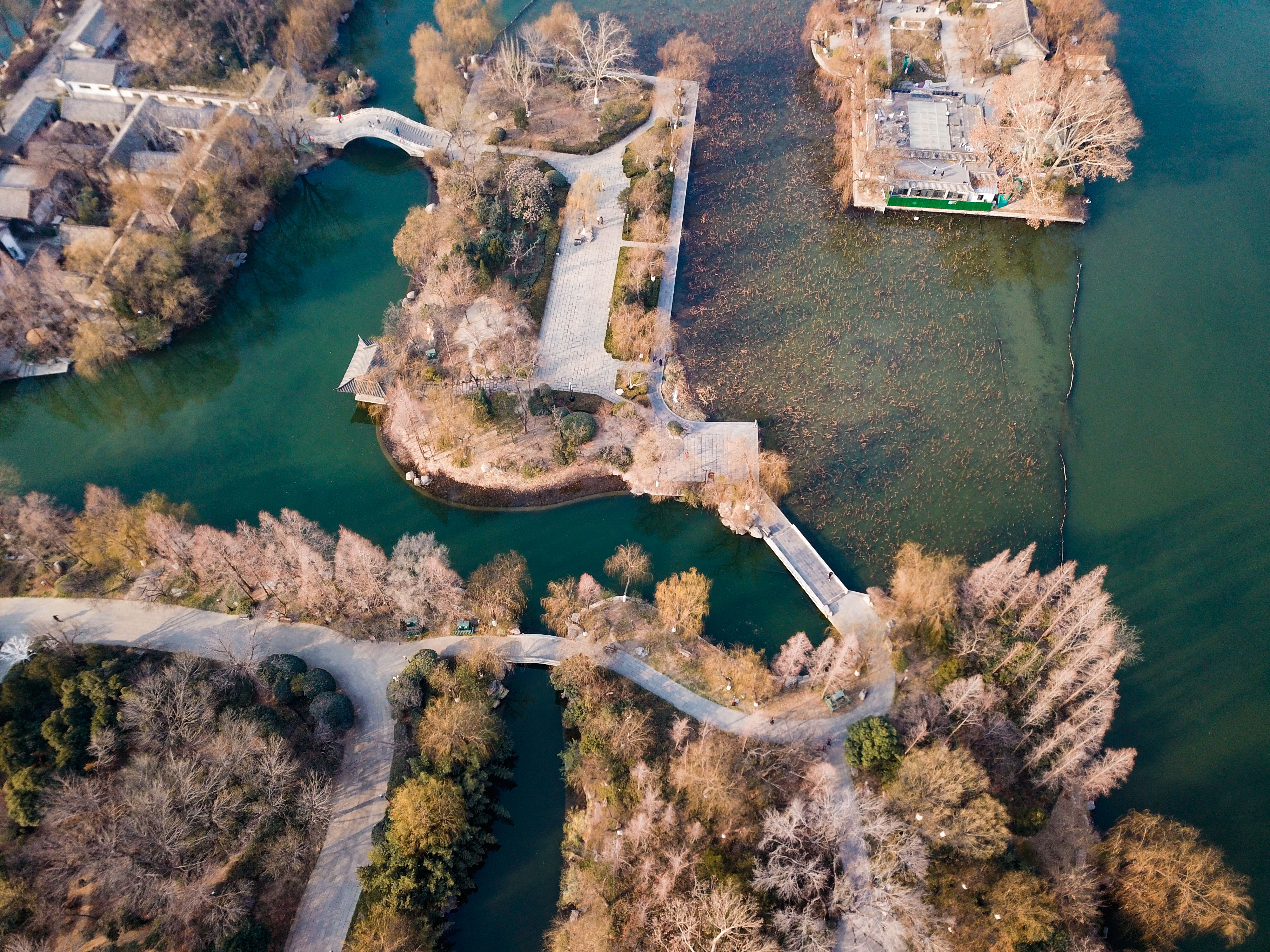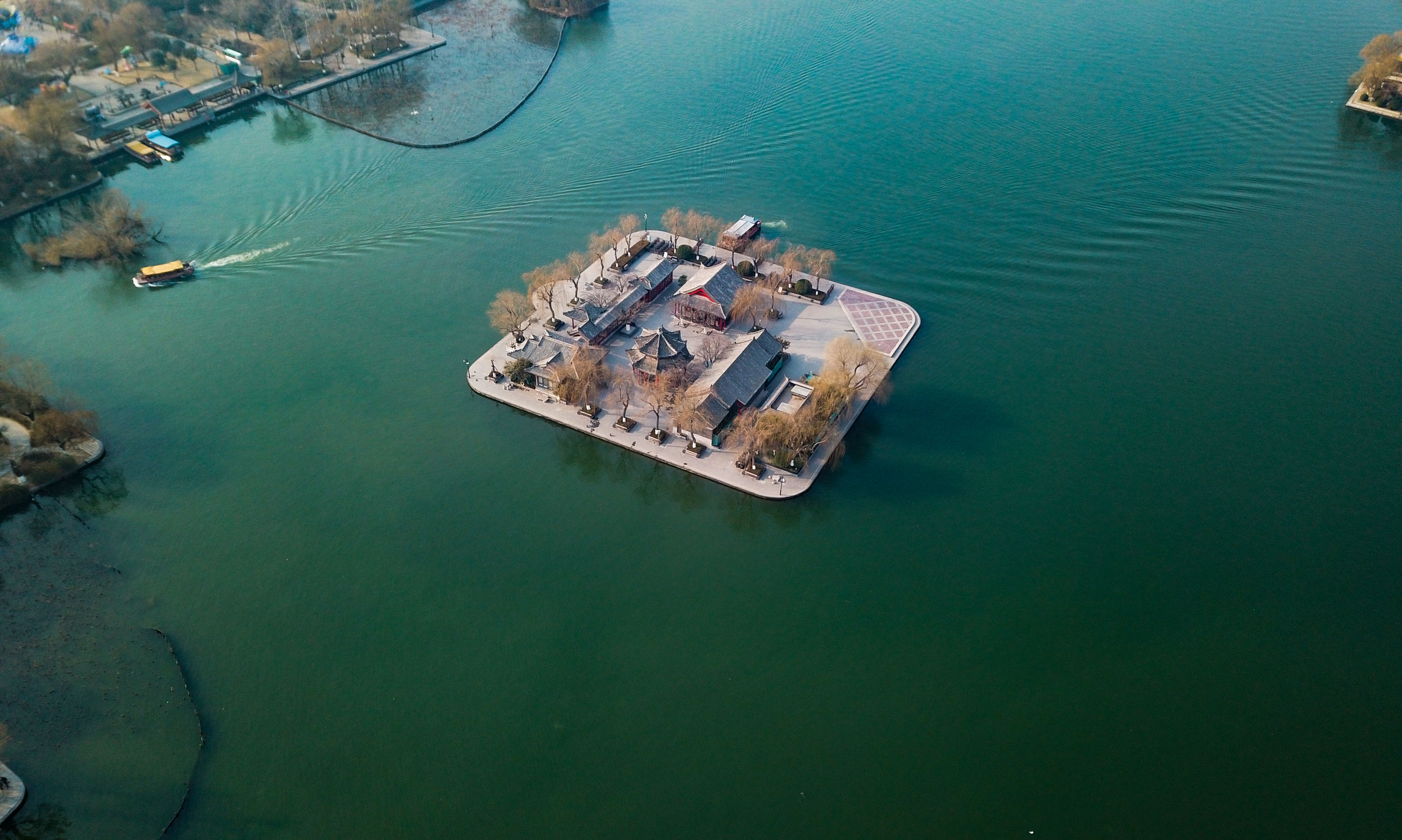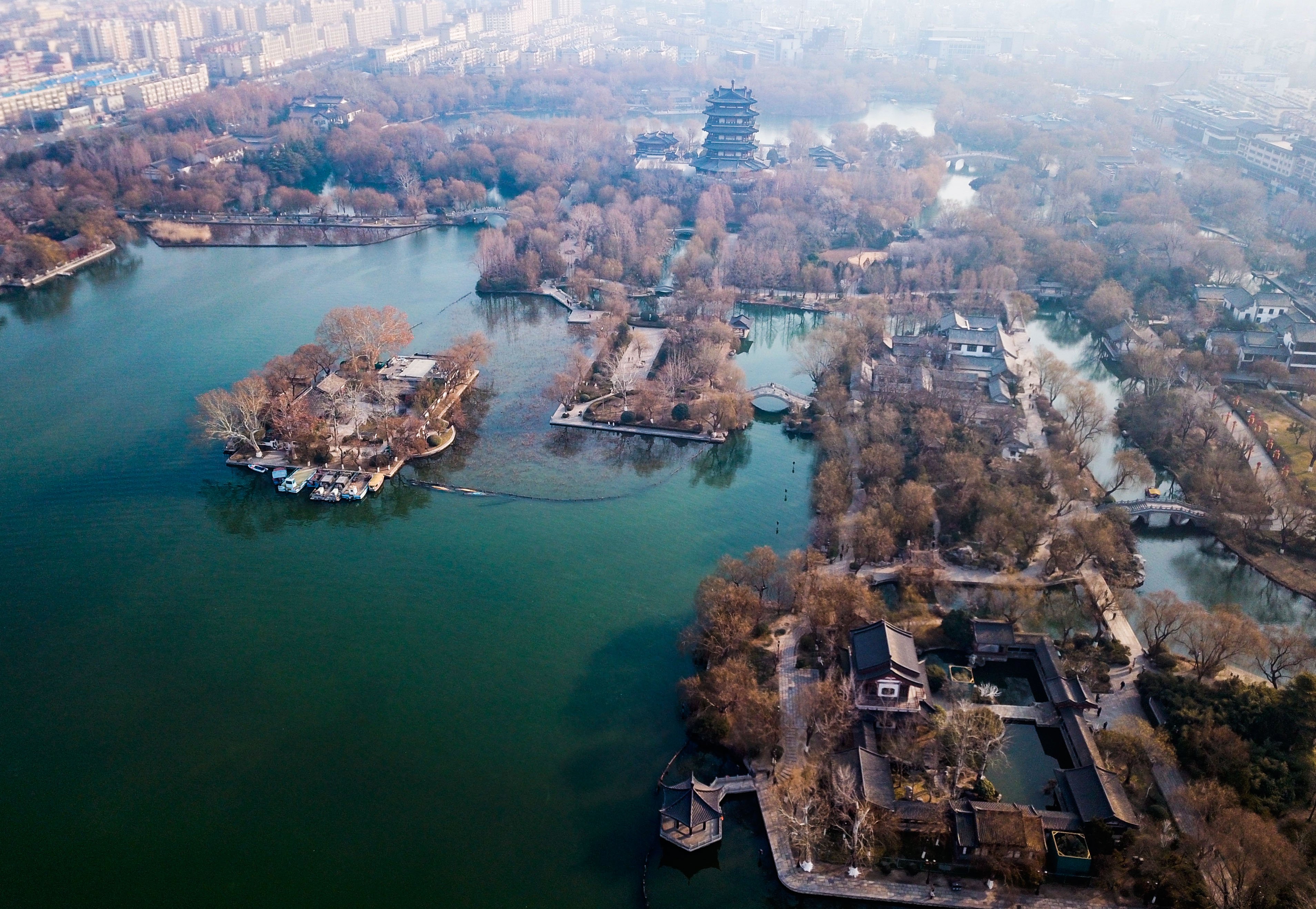 齐鲁晚报·齐鲁壹点记者 周青先 春节假日,航拍冬末的济南大明湖景区。沉静的蓝色湖面上,不时有水鸟缓缓飞过。湖岸边的树林呈现出红棕色,俯瞰犹如一幅设色水墨画。 立春季节已到,虽然济南的天气还冷,但大明湖的生命力正在孕育萌发。