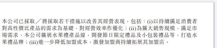 对于未来业绩改善,百果园表示,已采取或将采取三大措施以改善经营表现:优化经营效率以满足消费者对高性价比产品的需求;扩展水果礼产品线,开发节日限定礼品及小包装礼品;降低加盟成本,激发加盟商持续拓展其加盟店。