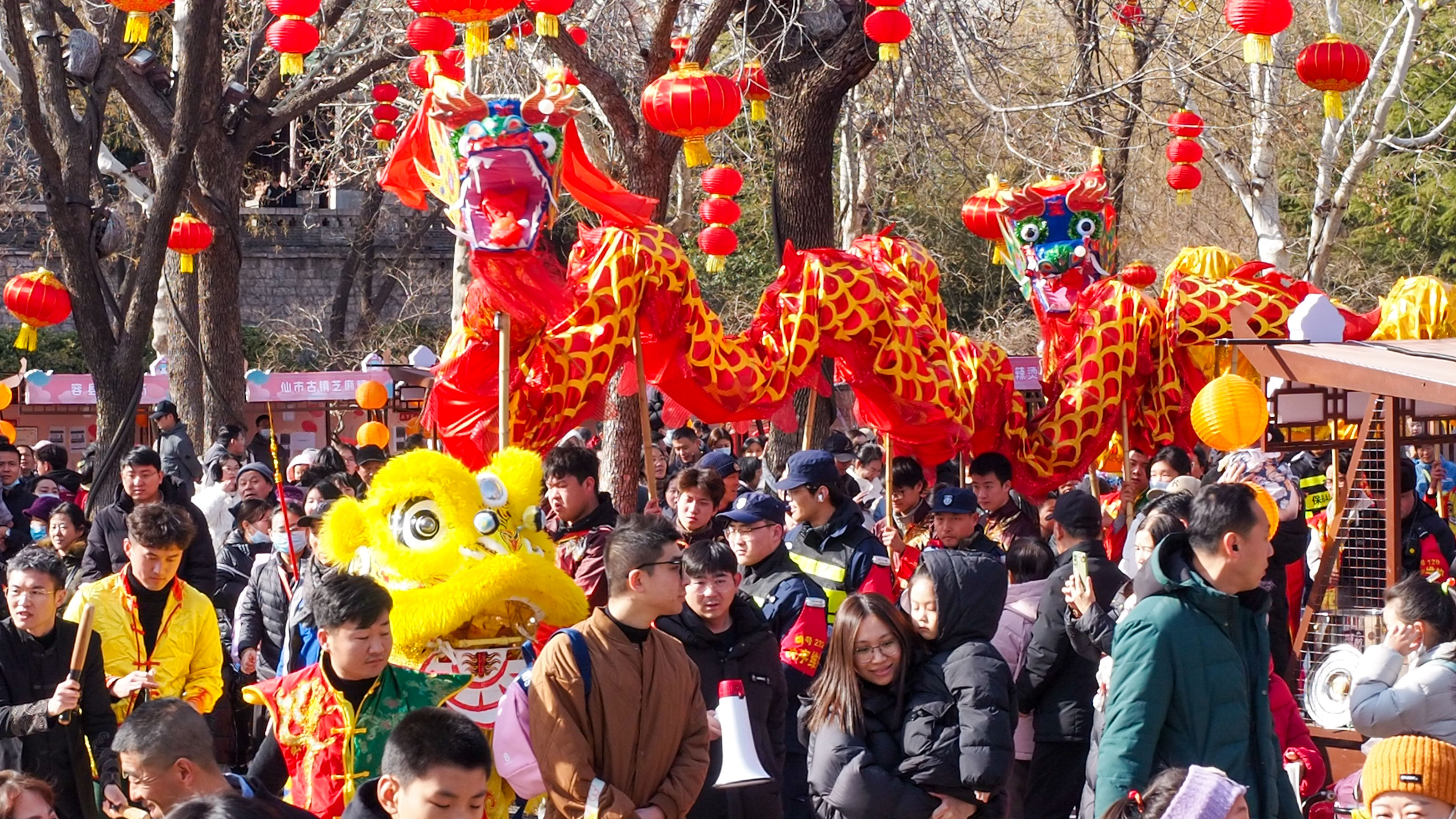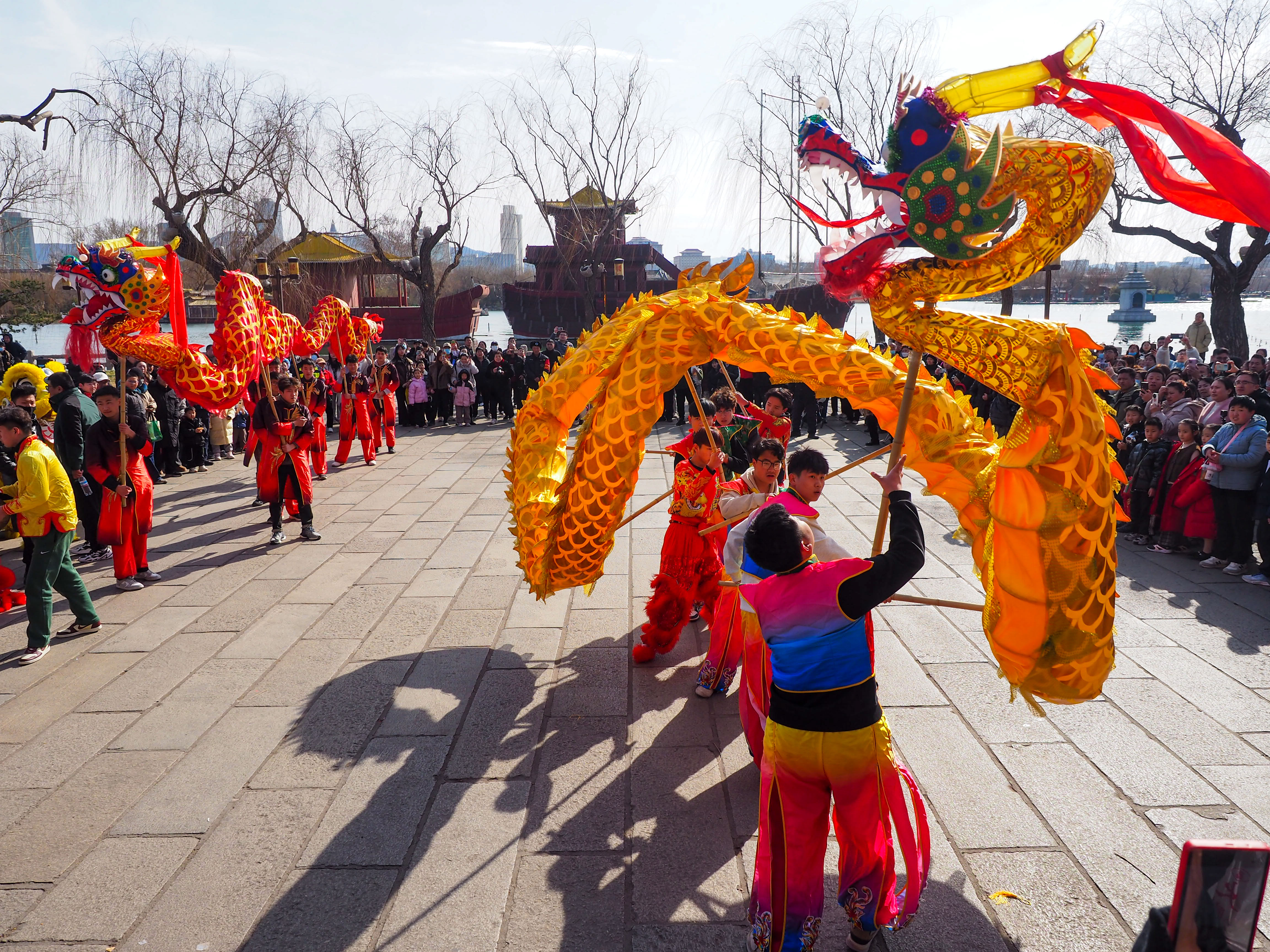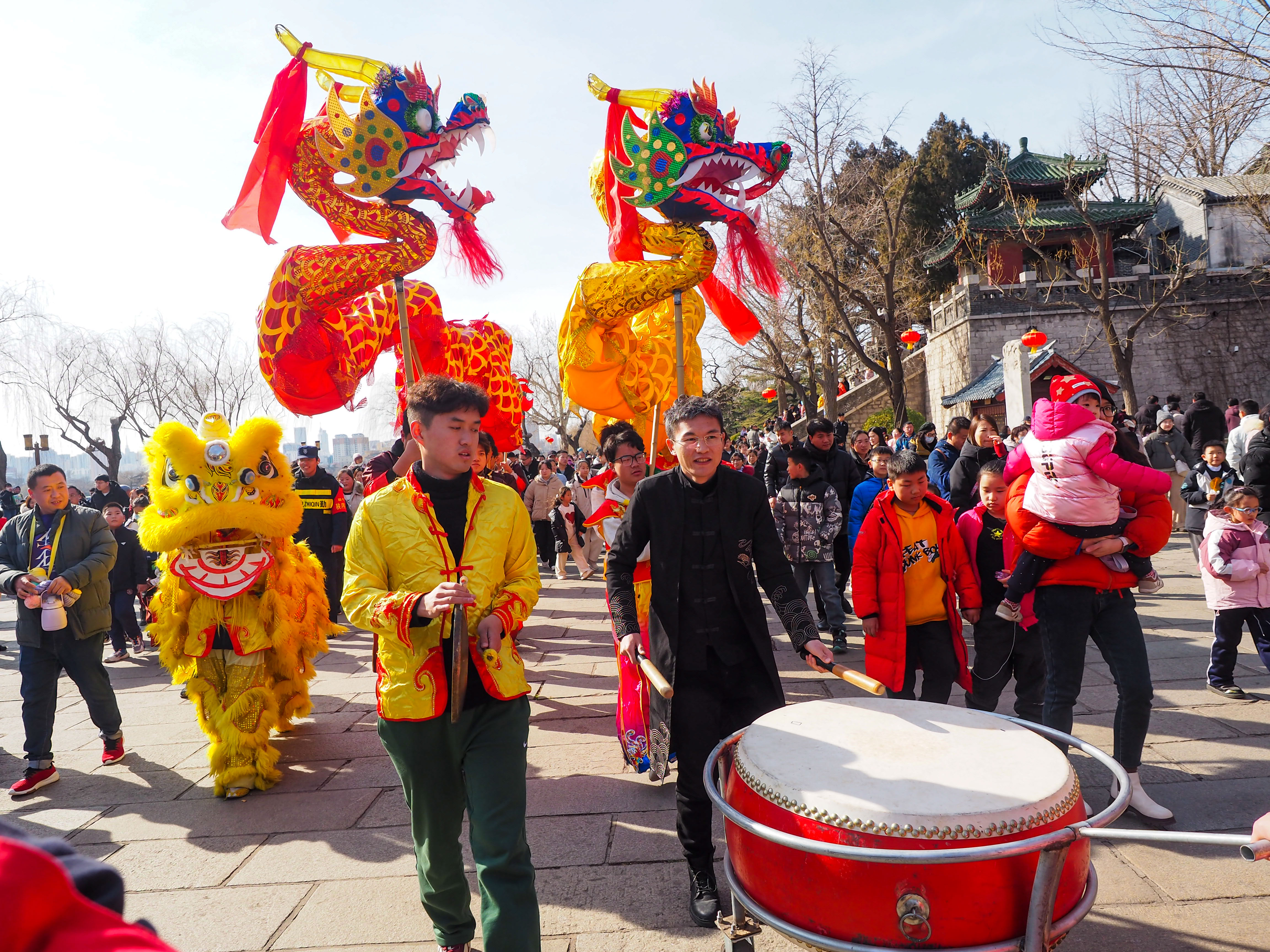 2月12日,济南大明湖畔,两只专业舞狮舞龙队伍巡游大明湖,沿途向游客们拜年。