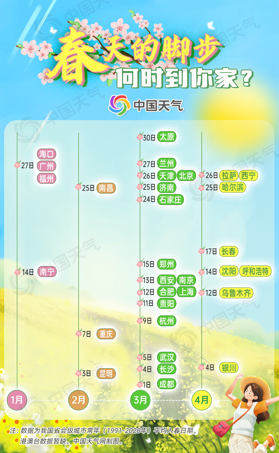中国天气网统计1991年至2020年的入季大数据发现,大城市中,最早入春的南宁,一般1月14日就会迈入春天的门槛,最晚盼到春暖的西宁和拉萨,则要等到4月26日,一南一北入春时间相隔102天。