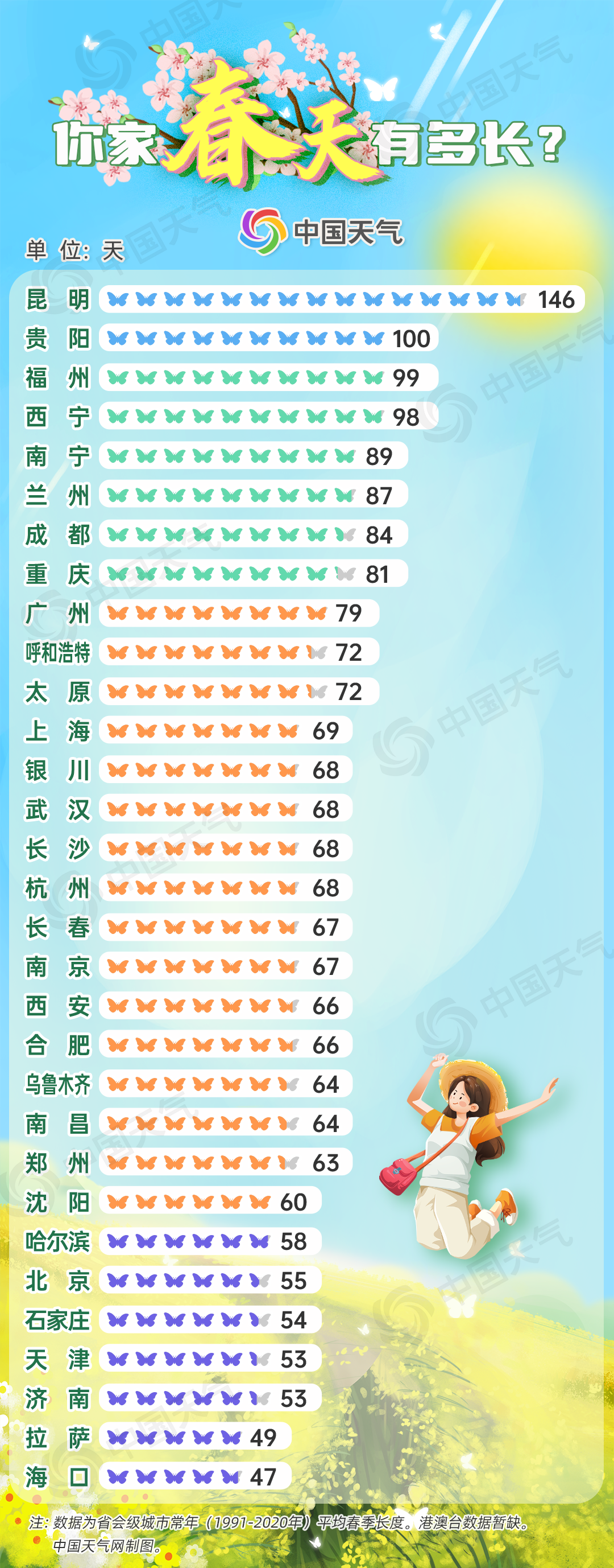 要说春日最长情的,莫过于“春城”昆明,春季长达146天。这里日照充足、气温较高,春天到来较早,再加上海拔较高、升温较慢,春季结束时间也相对较晚,因此能拥有一个漫长的春季。贵阳和福州紧随其后,分别以100天和99天的春季长度位居第二、三位,也是春日常驻代表。