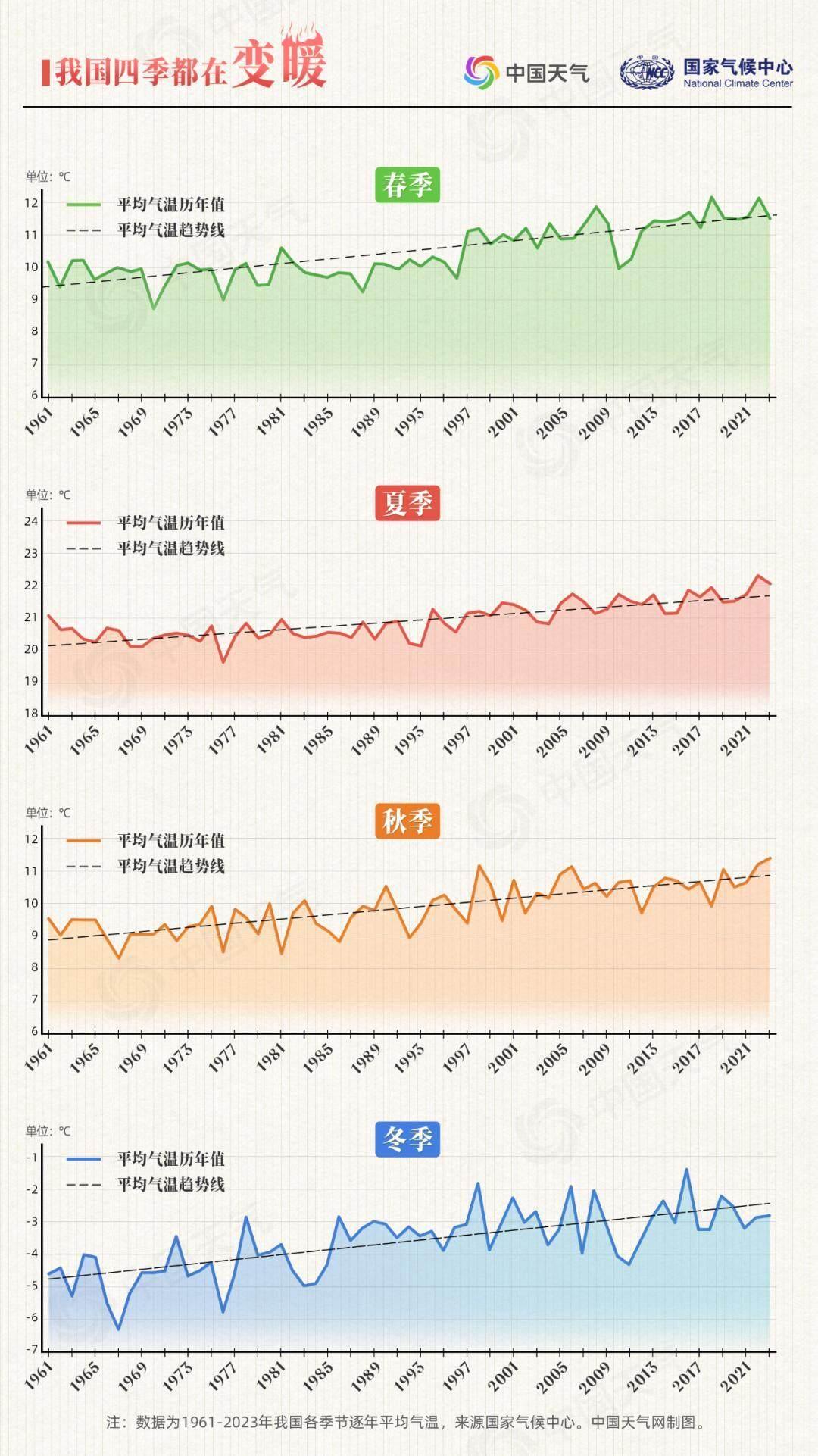 事实上,不止冬春回暖,我国春、夏、秋、冬四个季节也都在变暖。据2024年世界气象组织(WMO)发布的报告显示,我国最暖的春季和夏季均出现在2022年,最暖的秋季出现在2023年,最暖的冬季则出现在2016年。