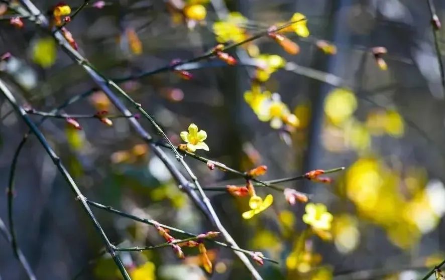 济南五龙潭公园迎春花绽放出金黄色的花瓣