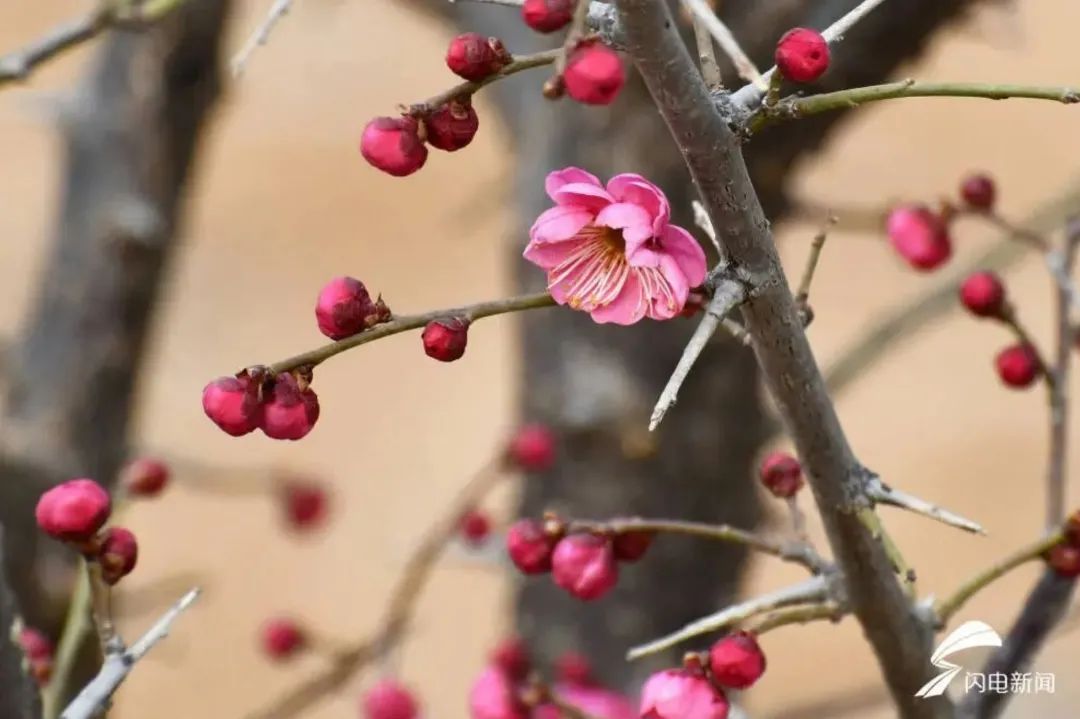 枣庄市山亭区紫云湖公园绽放的红梅花