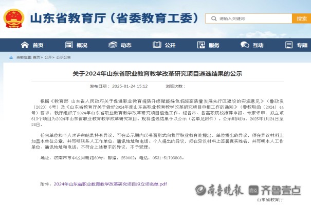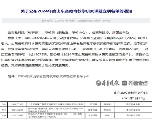 近日,从山东省教育厅和山东省教育科学研究院陆续传来喜讯,在2024年度省教育厅、省教科院教学研究课题的评选中,枣庄职业学院申报的《“以产定标、以企定教、以岗定训”数智化现场工程师多元化培养的研究与实践》等5个项目入选2024年山东省职业教育教学改革研究项目;《四融入 三贯通 三协同:“大思政课”视域下高职思政课教学模式的创新与实践》等3项课题入选2024年度山东省教育教学研究课题。2025年新学期伊始,8项省级课题同时入围,立项数量和立项率较往年有大幅提升,学院省级科研项目迎来开门红。