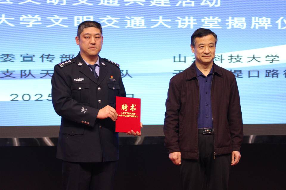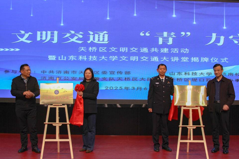 为进一步加强学校交通安全管理,切实提升广大师生交通安全意识和防范能力,引导广大师生争做文明交通的践行者和宣传员,3月6日,山东科技大学济南校区携手济南市天桥区委宣传部、济南市公安局交警支队天桥区大队,共同举办了“天桥区文明交通共建活动暨山东科技大学文明交通大讲堂”揭牌仪式。