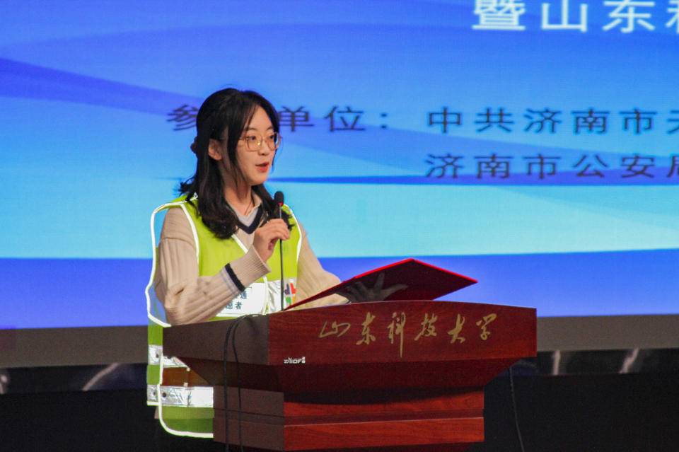 仪式上,天桥区属地单位与校区相关部门负责人先后为“山东科技大学文明交通大讲堂”“新时代文明交通实践共建基地”进行揭牌,向区交警大队相关负责同志颁发聘书,赠送文明交通志愿者反光背心,学生代表向全体师生发出文明倡议。