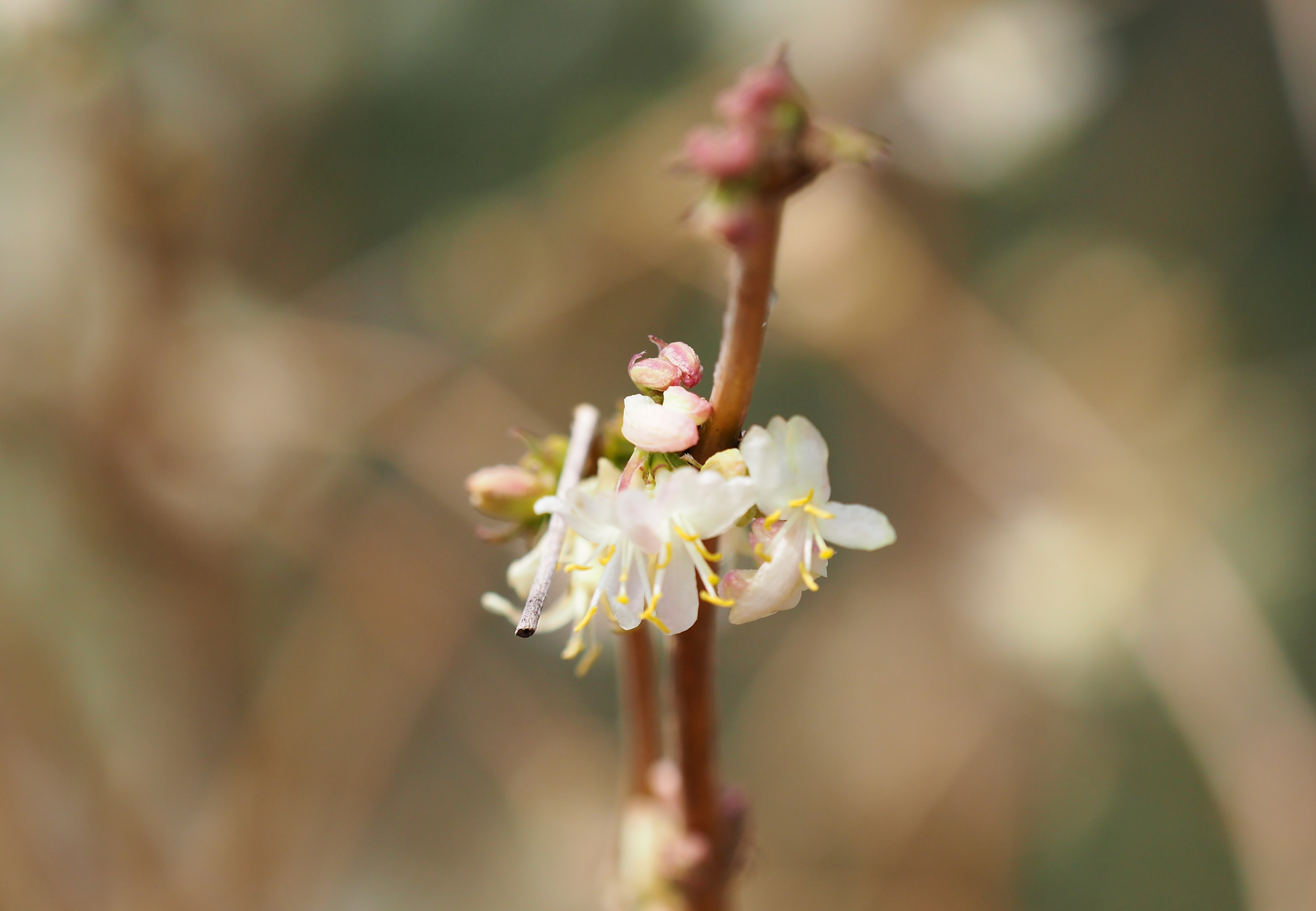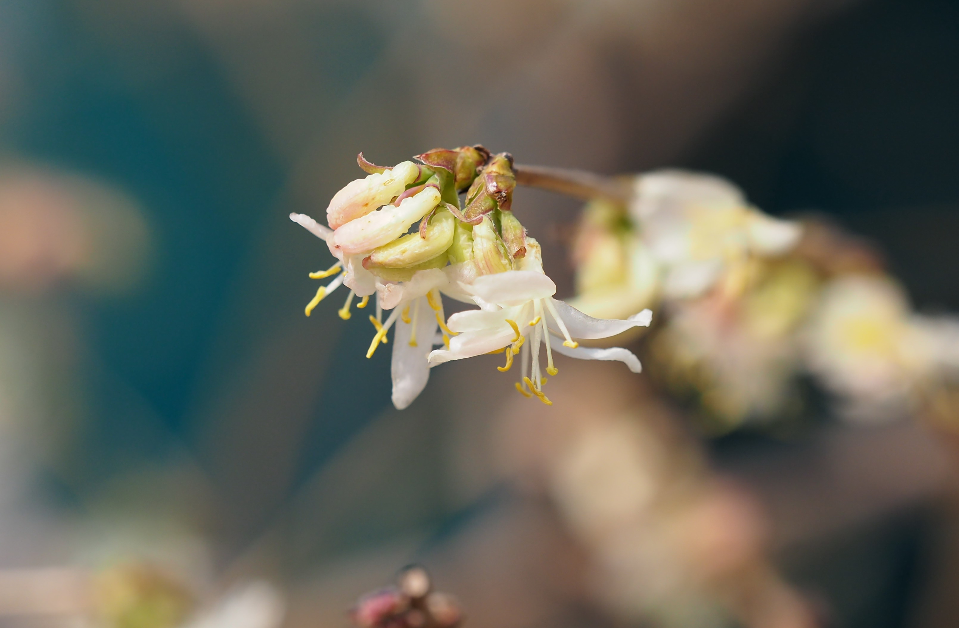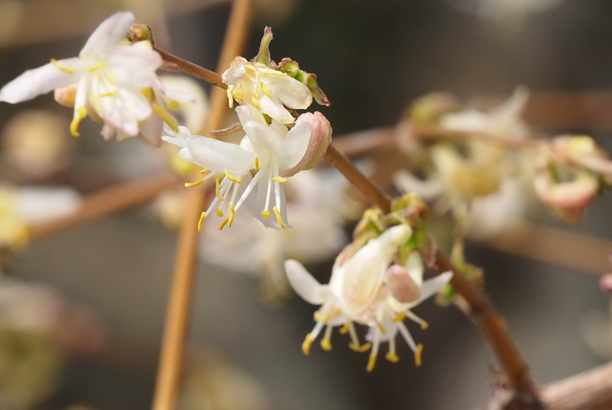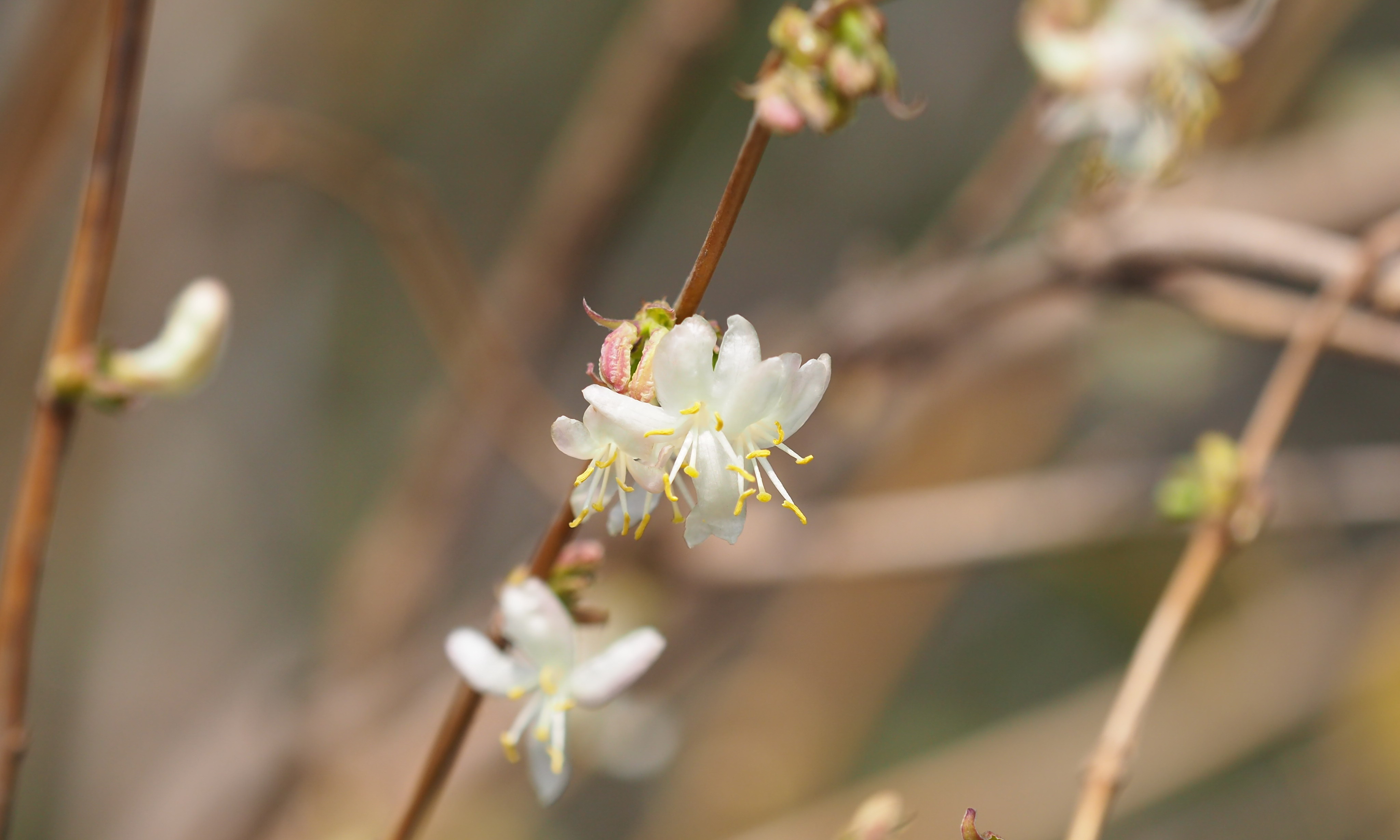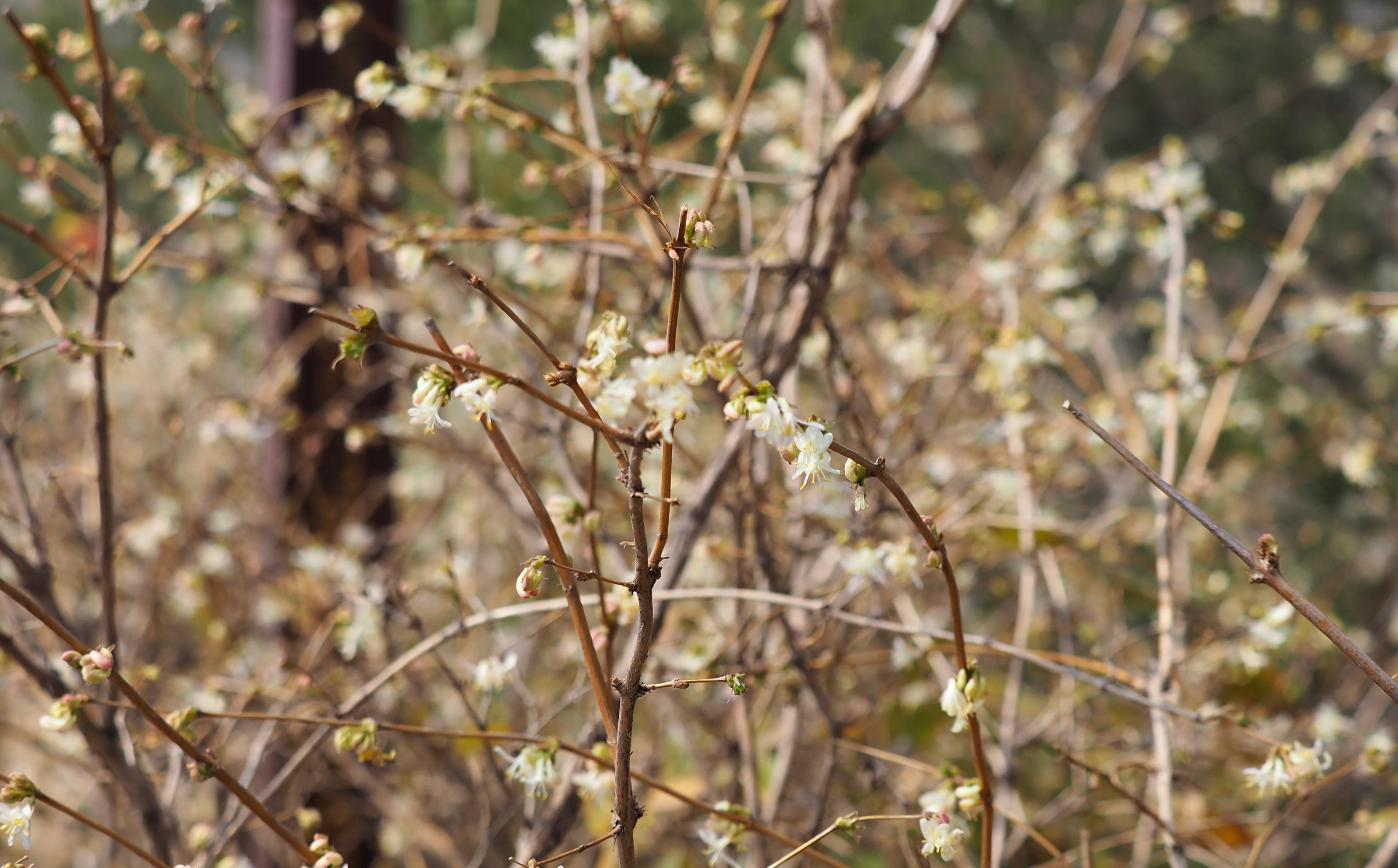 齐鲁晚报·齐鲁壹点记者 周青先 3月12日,济南大明湖北岸,一株不起眼的灌木丛散发出迷人的香气。近距离看,干枯的枝条开出晶莹剔透的小白花,香气十分迷人。 它叫郁香忍冬,是忍冬科忍冬属植物,在叶片还没有苏醒时花朵就顶着寒风开放了。它的花朵洁白素净,花苞微微泛粉,和蜡梅一样冰肌玉骨香气迷人。