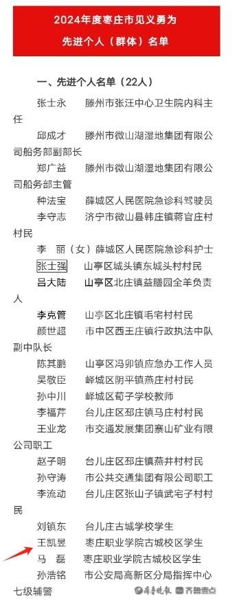 为表彰先进,弘扬正气,倡导良好社会新风尚,近日,枣庄市委政法委、市见义勇为基金会印发表彰决定,授予22名同志“枣庄市见义勇为先进个人”称号,枣庄职业学院旅游管理系2022级学生王凯昱、马磊光荣上榜。