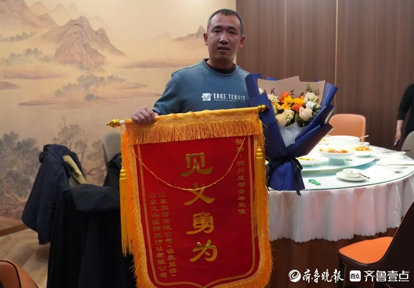 “来一趟山东,带了一面锦旗回去。”当晚,赵佳在朋友圈里写到。救人后,不少围观市民纷纷为赵佳“点赞”,承接赵佳一行的旅行社也在18日晚上举行了表彰仪式,为赵佳送上了锦旗和鲜花。