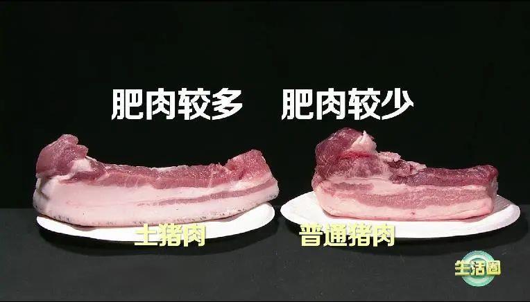 土猪肉一般肥肉比较多,所以它的背膘会比较厚,像五花肉它可能有2~3指的背膘,普通猪肉瘦肉率比较高,所以背膘比较薄。