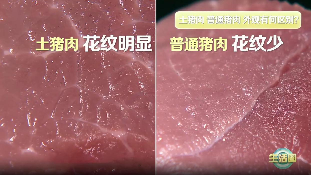 土猪肉大理石花纹特别明显,因为它肌间脂肪、肌内脂肪的含量比较高,但是普通猪肉大理石花纹比较少,因为它的肌内脂肪含量要低一些。