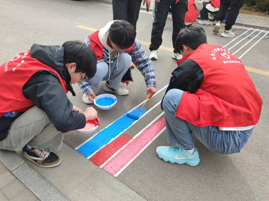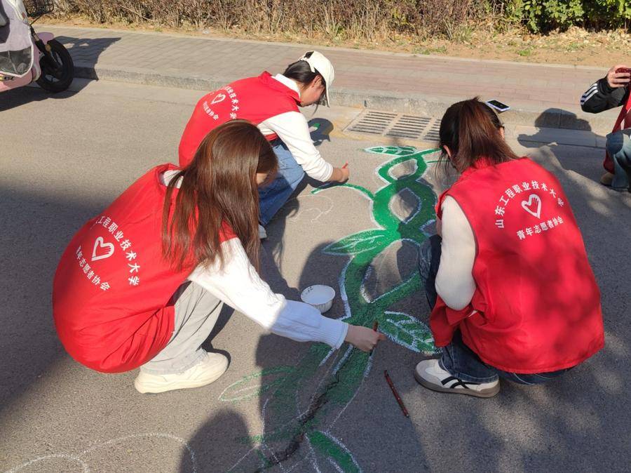 山东工程职业技术大学(智能制造学院)的志愿者们还发挥创意,在小区路面上绘制了一幅幅色彩鲜艳的图案,让原本单调的道路被赋予新生命,引得居民纷纷驻足称赞。