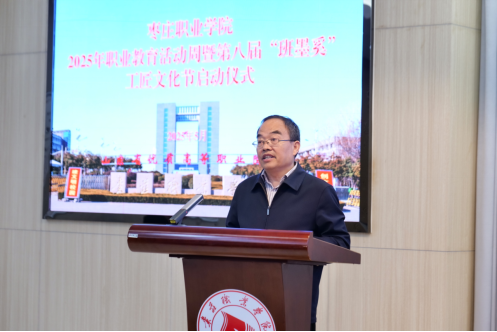 今年职业教育活动周主题为“一技在手、一生无忧”。会上,教务处负责人宣读了《枣庄职业学院2025年职业教育活动周暨第八届“班墨奚”工匠文化节实施方案》。