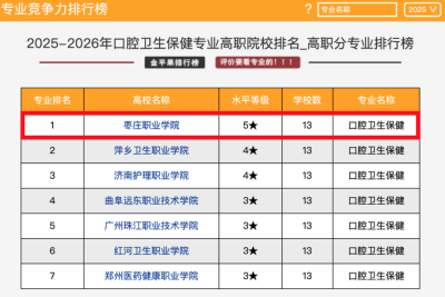 5月17-18日,第四届全国“双高计划”质量建设与评价论坛在江苏无锡召开,会上正式发布了“金平果”2025年高职专业及高水平专业群综合竞争力评价结果,枣庄职业学院口腔卫生保健专业荣登榜首。