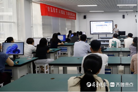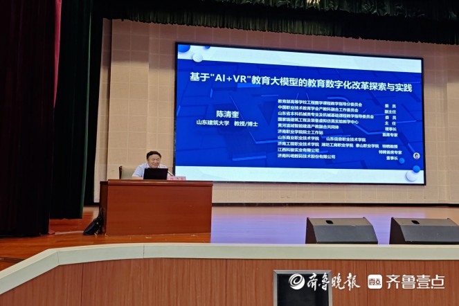 活动邀请山东建筑大学、济南科明数码技术股份有限公司陈清奎教授担任主讲嘉宾。陈清奎以“‘AI+VR’教育大模型在教育数字化改革中的应用路径探索”为主题,系统阐述了“AI+VR”教育大模型驱动的教育数字化改革理念,提出基于VR技术的“五金”建设方案,并结合自身教学经验,展示了如何利用“AI+VR”技术进行智能体开发,优化课程内容,为现场教师提供了宝贵的实践参考。