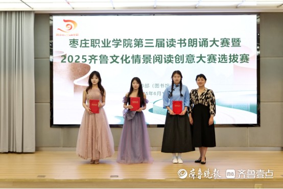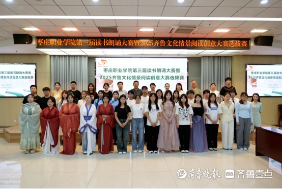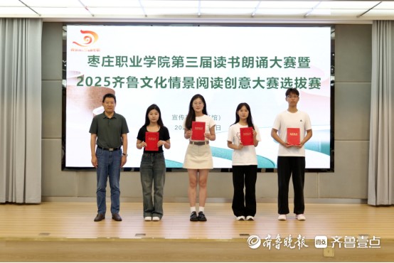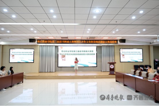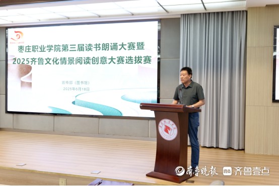近日,枣庄职业学院第三届读书朗诵大赛暨“齐风鲁韵・阅创华章”2025齐鲁文化情景阅读创意大赛选拔赛在学术报告厅成功举办。枣庄职业学院党委委员、宣传部部长、统战部部长郝艺出席活动并致辞。枣庄市文化和旅游事业发展中心党委委员、枣庄市图书馆党支部书记、馆长袁磊出席活动。枣庄市图书馆及学院宣传部、学生工作处(团委)、马克思主义学院相关负责同志参加活动。