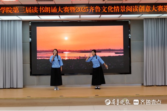 比赛现场,15组参赛选手精神饱满、声情并茂,以情景朗诵、创意情景剧等形式,将齐鲁文化的深厚底蕴与时代特色巧妙融合。舞台上,时而传来激昂澎湃的朗诵,重现台儿庄战役中齐鲁英雄儿女浴血奋战的悲壮场景,带观众回溯那段保家卫国的峥嵘岁月;时而流淌细腻婉转的诉说,解读儒家、墨家等先贤智慧,传递“仁爱”“兼爱非攻”的思想精髓。选手们借助精心搭配的音乐、契合主题的服装道具,从台儿庄古城斑驳的城墙到先贤典籍里的字字珠玑,生动勾勒出齐鲁大地的人文画卷,让观众仿佛穿越时空,领略千年文脉的独特魅力,现场掌声此起彼伏,气氛热烈非凡。