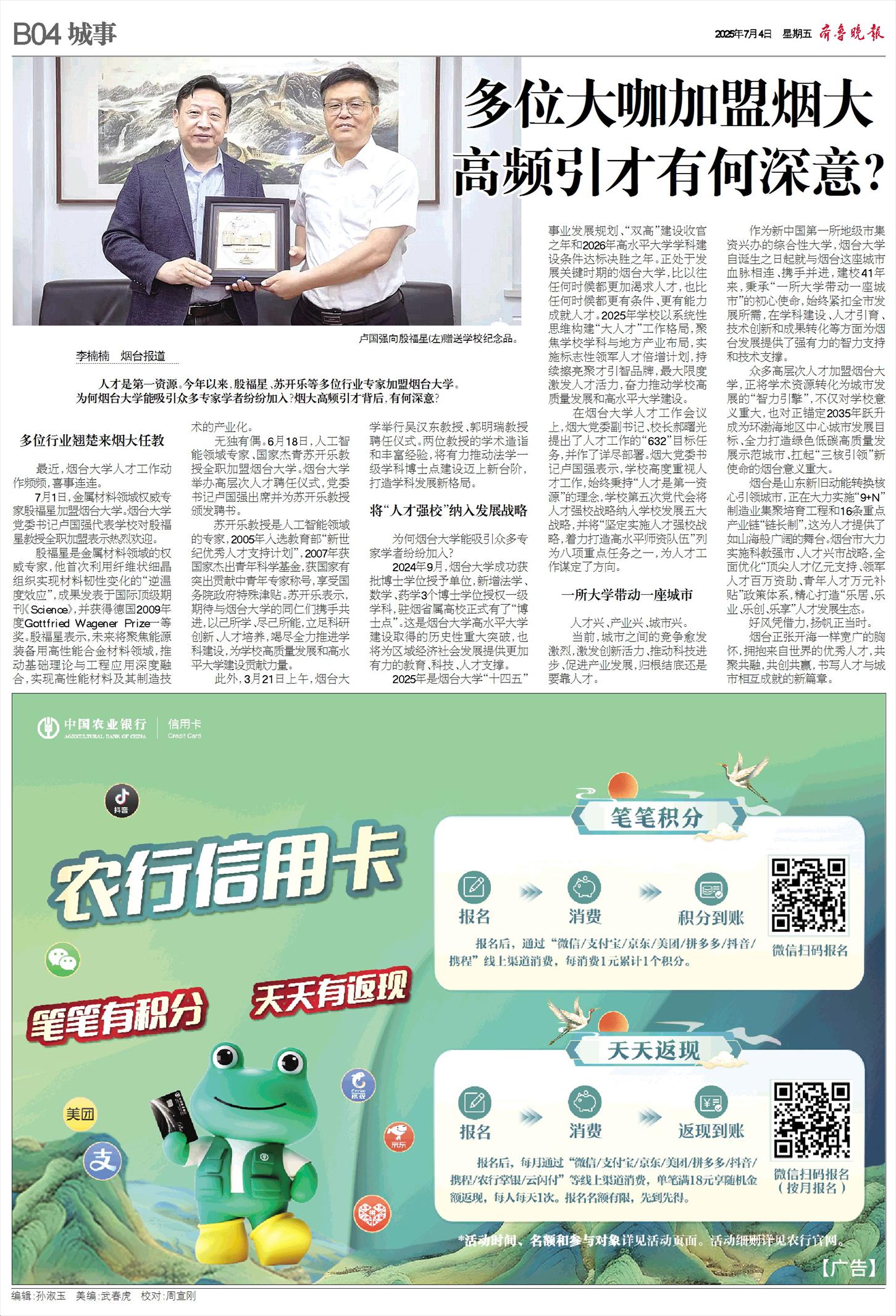 众多高层次人才加盟烟台大学,正将学术资源转化为城市发展的“智力引擎”,不仅对学校意义重大,也对正锚定2035年跃升成为环渤海地区中心城市发展目标、全力打造绿色低碳高质量发展示范城市、扛起“三核引领”新使命的烟台意义重大。