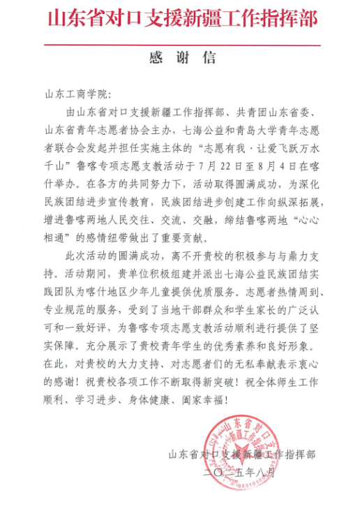 近日,山东省对口支援新疆工作指挥部向山东工商学院发来感谢信,向该校参与2025年“志愿有我·让爱飞跃万水千山”鲁喀专项志愿支教活动的师生表示诚挚感谢。信中指出,山东工商学院青年师生以热情周到、专业规范的服务投身支教活动,赢得了当地干部群众和学生家长的广泛认可和一致好评,为鲁喀专项活动的顺利开展提供了坚实保障。