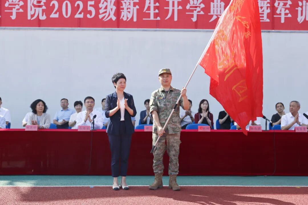 郝燕向军训团郑重授旗。