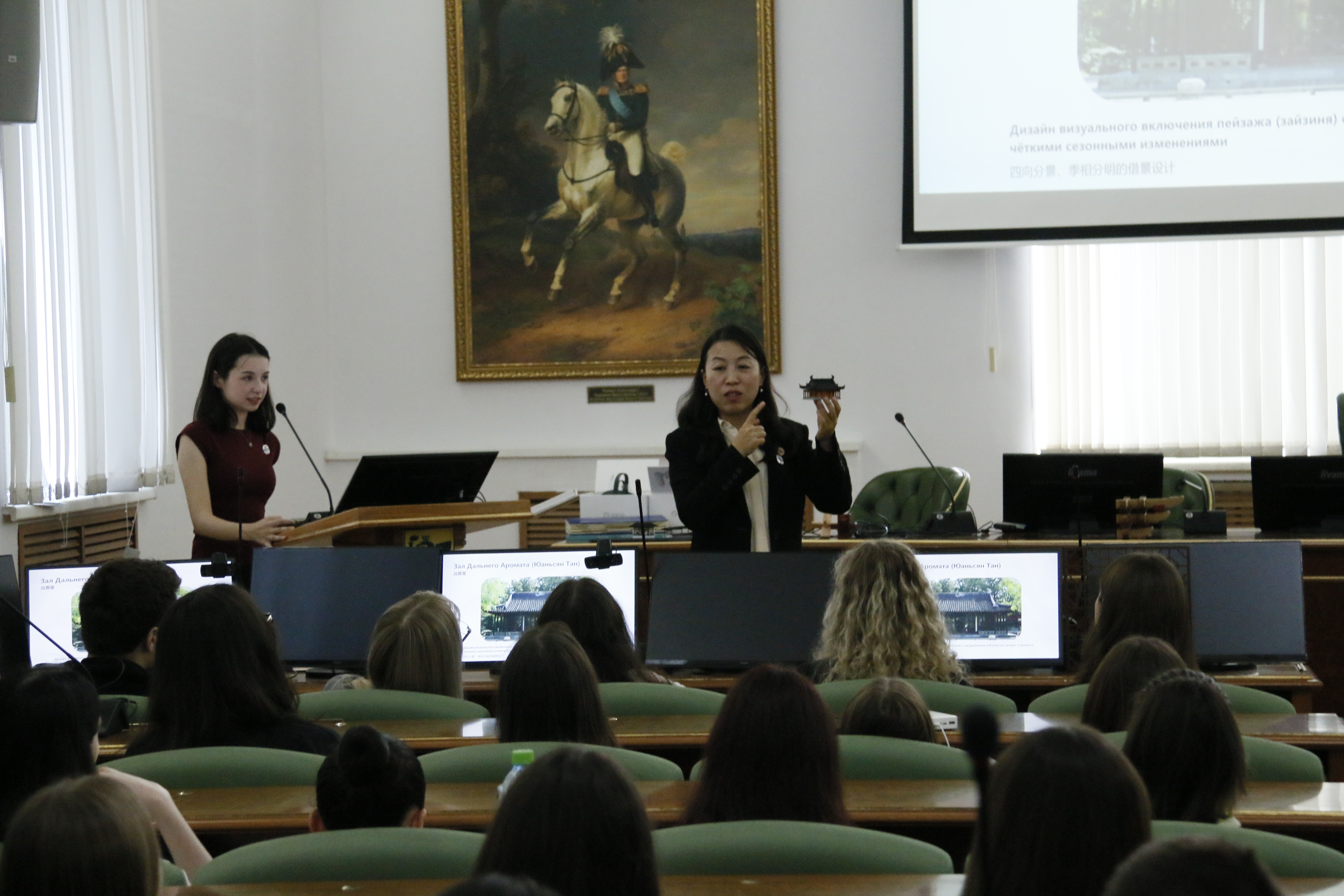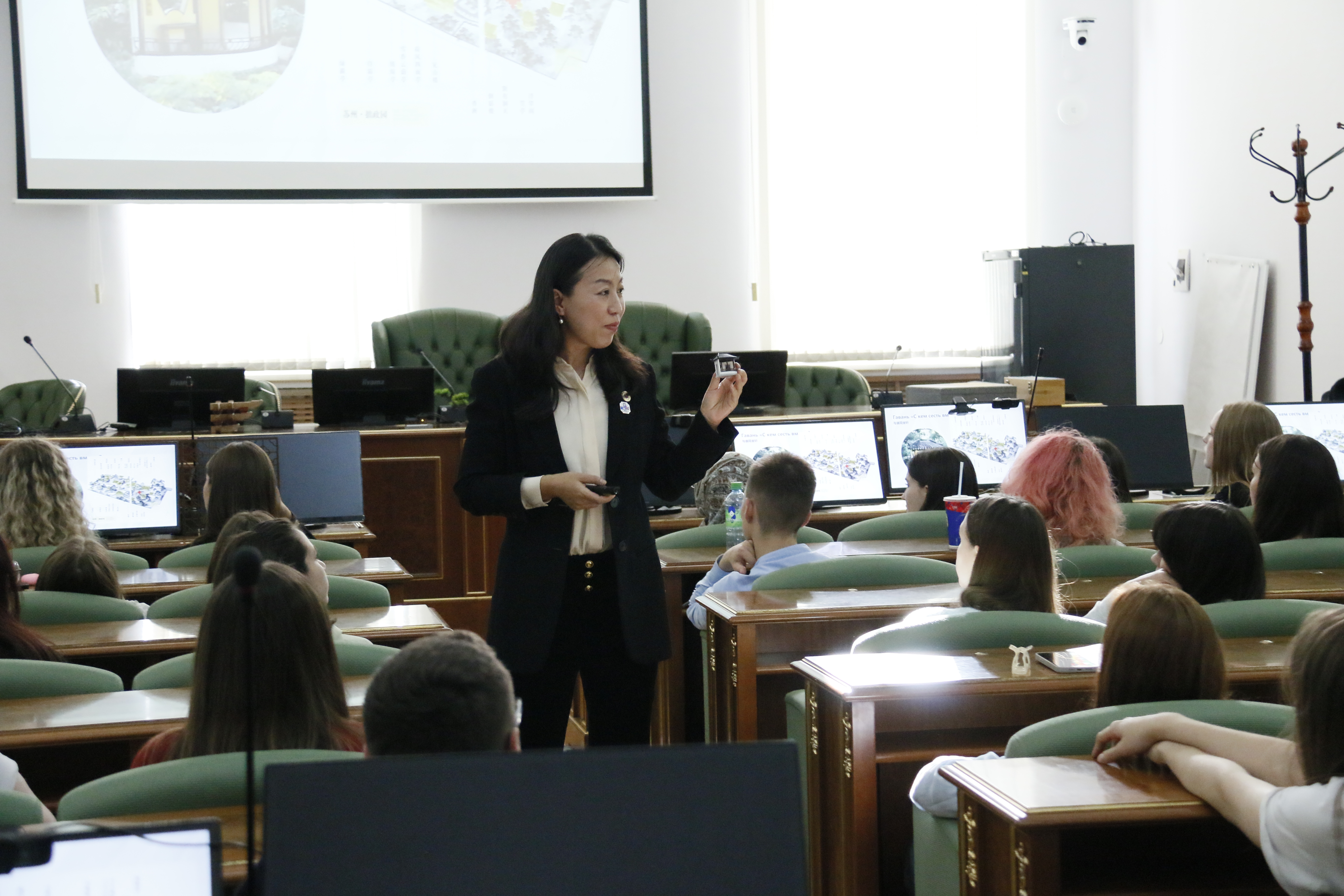 “这种全新的学习体验加深了我对中华文化的理解,我希望以后能真的去中国看看这些美丽的地方。”参与讲座的同学在体验了VR漫游之后激动地分享。为让文化传播更具感染力,巡讲团带来丰富的实物与数字载体:3D微缩模型还原拙政园景观细节,1.8米长的纸雕模型、8米长的摄影作品长卷细致呈现中国孔庙的建筑与雕塑艺术;VR园林漫游系统突破时空限制,为现场受众打造沉浸式“云游”体验;AI双语解说小程序收录核心自然文化符号,受众扫码即可获取中俄文对照解读,让文化探索从单向接收变为互动参与。