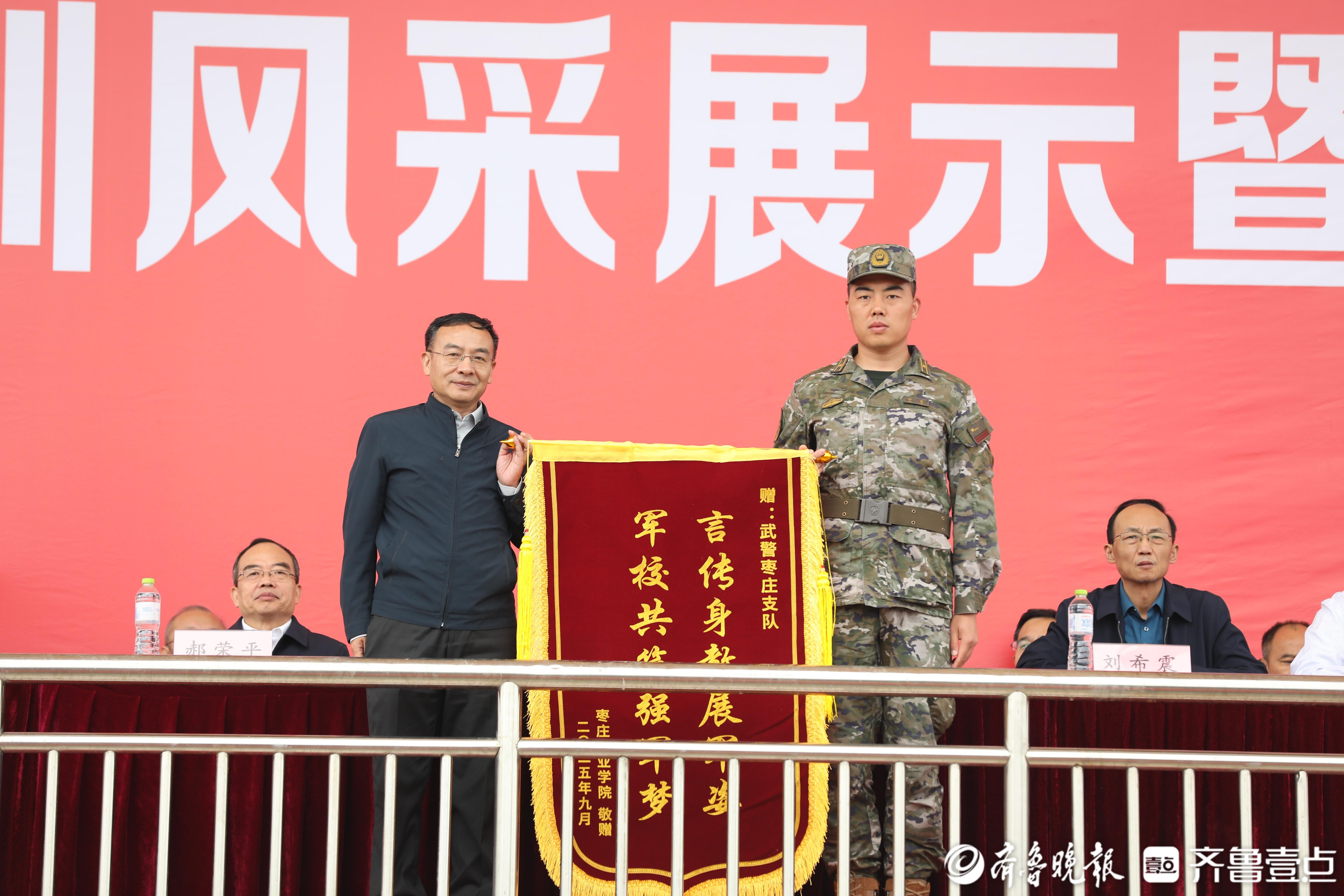 活动中,梁家和代表学院为武警枣庄支队赠送锦旗。