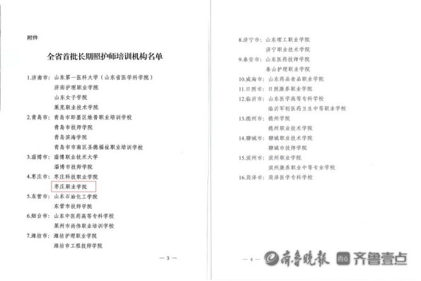 近日,山东省医疗保障局、山东省人力资源和社会保障厅联合发布《关于公布我省首批长期照护师培训机构名单的通知》(鲁医保函〔2025〕40号),正式公布全省首批长期照护师培训机构名单。枣庄职业学院成功入选,成为枣庄市两家获此资质的院校之一,标志着学院在康养服务类人才培养领域迈上新台阶。