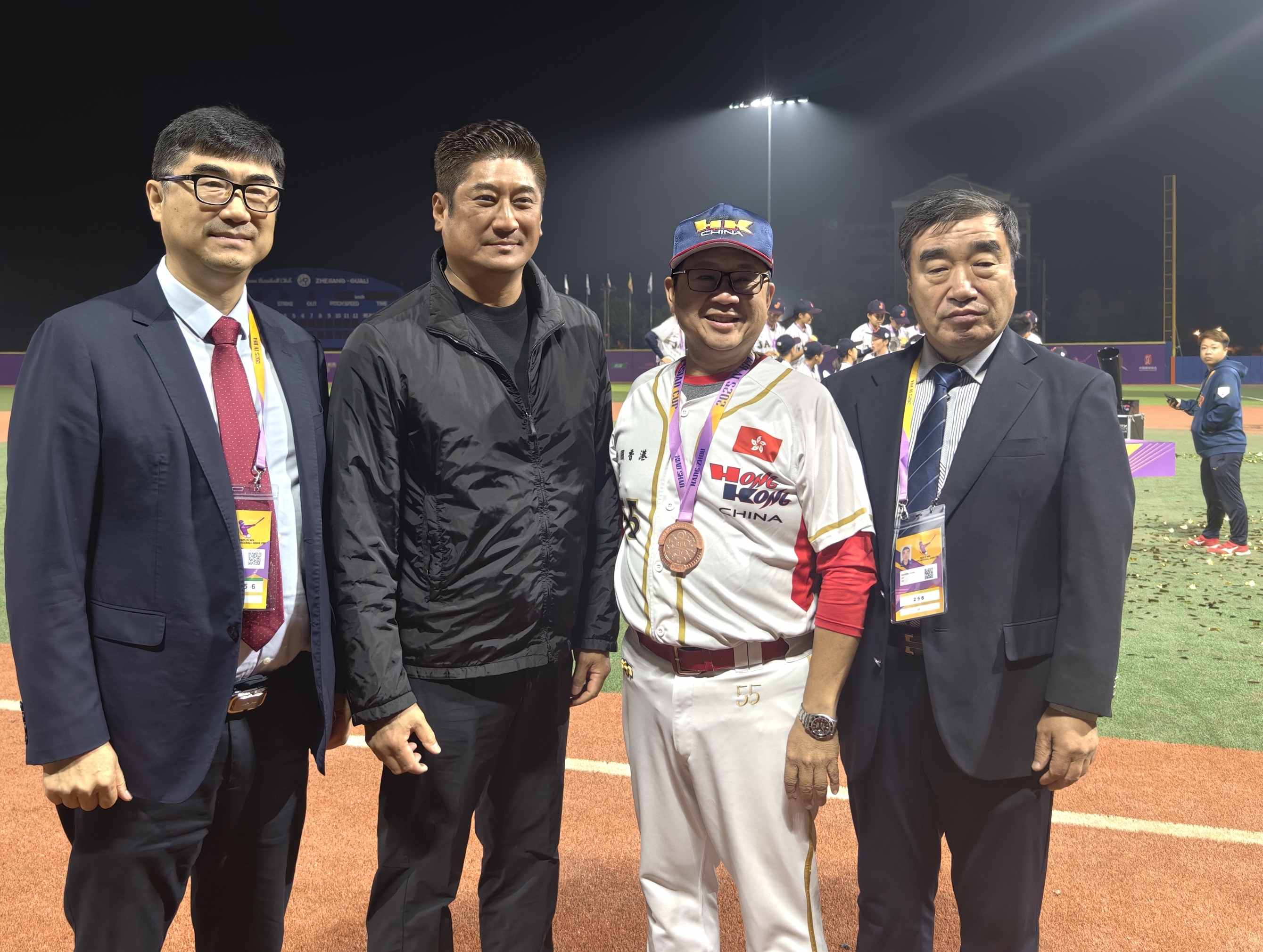 鹿扬体育董事长郑晓平(左四)与中国棒球协会会长陈旭、亚洲棒球联合会会长辜仲谅、中国香港女子棒球队领队区学良(左至右)合影。