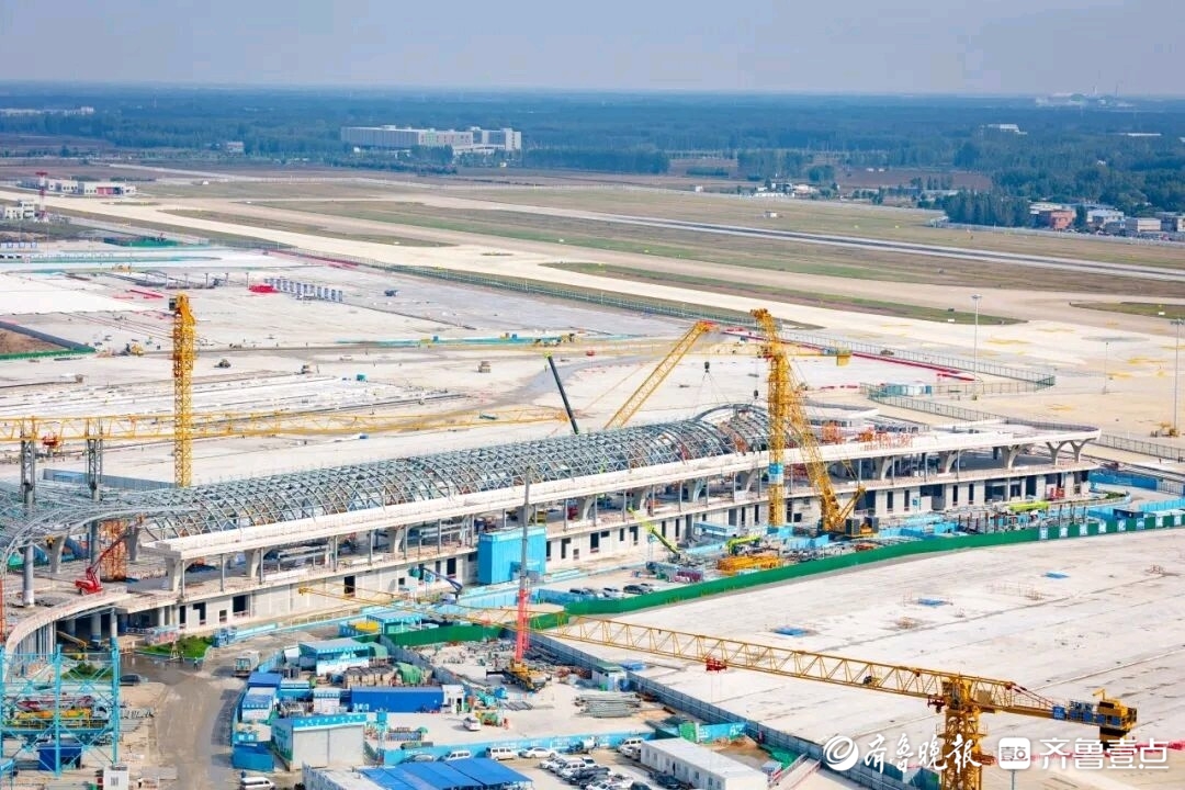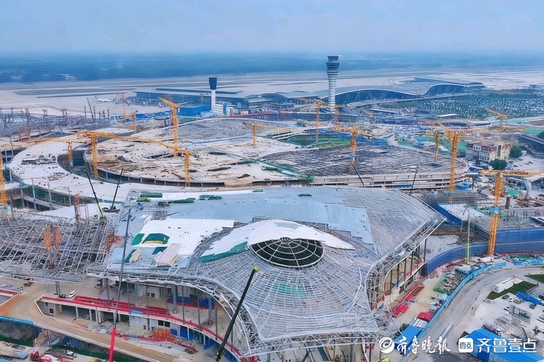 T2航站楼总建筑面积60万平方米,采用主楼+六指廊构型,呈现“大集中、小分散”布局,向心环抱、分段落客、分区值机,实现高效运行,最大限度缩短旅客步行距离、提升出行效率。2025年,济南机场二期工程全面加速,T2航站楼各节点按期完成,综合交通中心主体结构封顶,新塔台完成建设,西一、西二两条3600米跑道基本成型。