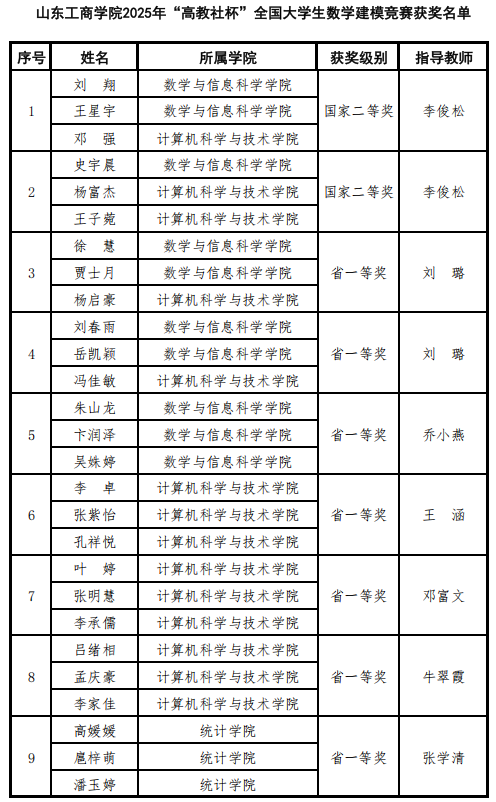近日,由中国工业与应用数学学会指导、全国大学生数学建模竞赛组织委员会主办的2025年全国大学生数学建模竞赛获奖名单正式揭晓,山东工商学院学子凭借扎实的专业素养与出色的创新能力斩获37项奖项,其中国家二等奖2项、省级一等奖7项、省级二等奖15项、省级三等奖13项,获奖数量实现了山东工商学院在该项赛事上的新突破。