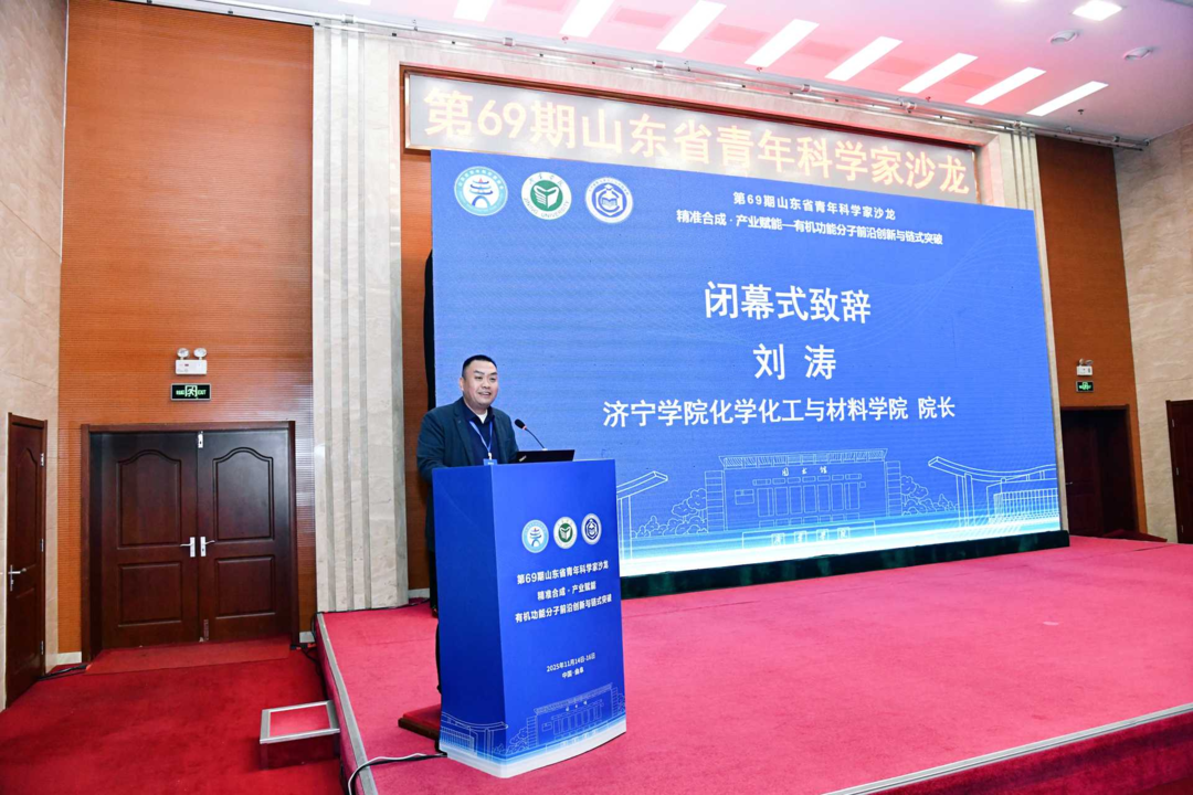 闭幕式由济宁学院化学化工与材料学院院长刘涛致辞。刘涛代表济宁学院感谢了与会专家学者和工作人员,回顾了会议期间围绕有机功能分子前沿创新与链式突破所开展的深入交流与合作,强调了青年科学家的学术热情与创新活力,并展望了未来科研协同与产业发展的广阔前景。
