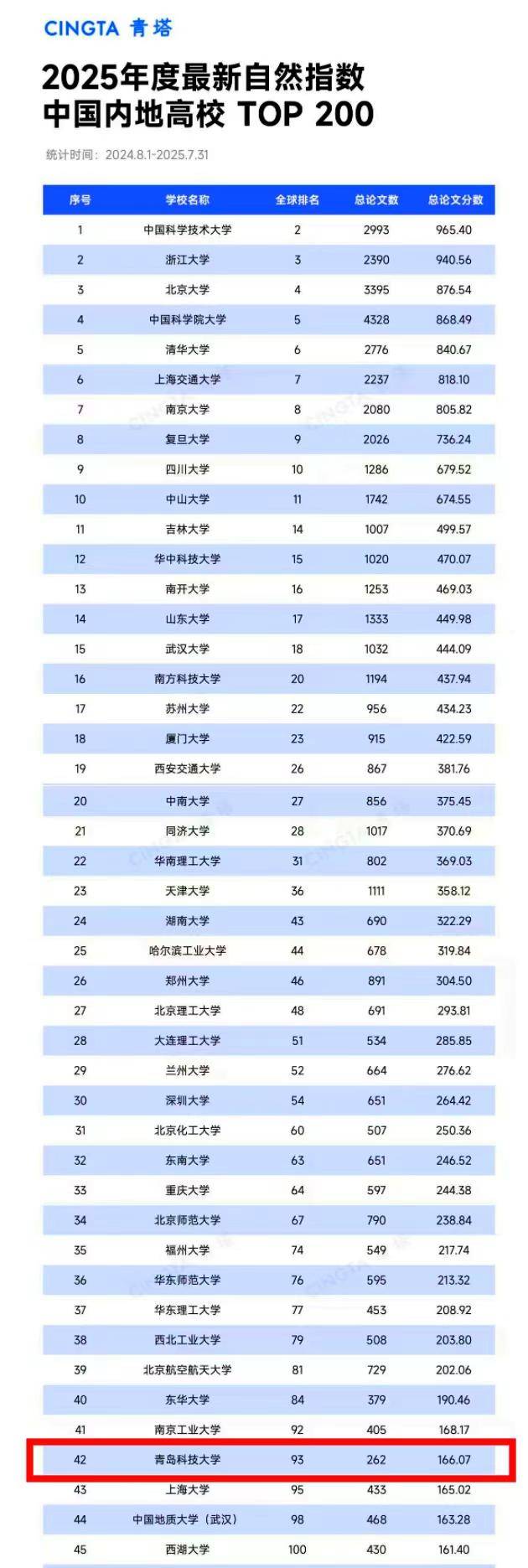 近日,自然指数(Nature Index)官网发布了最新自然指数排名(统计时间节点为2024.8.1-2025.7.31),青岛科技大学自然指数排名再创新高,位居全球高校第93位,首次跻身全球前100强,在中国内地高校自然指数排名中位居第42位,实现了历史性突破,标志着学校在自然科学领域的综合实力明显增强。