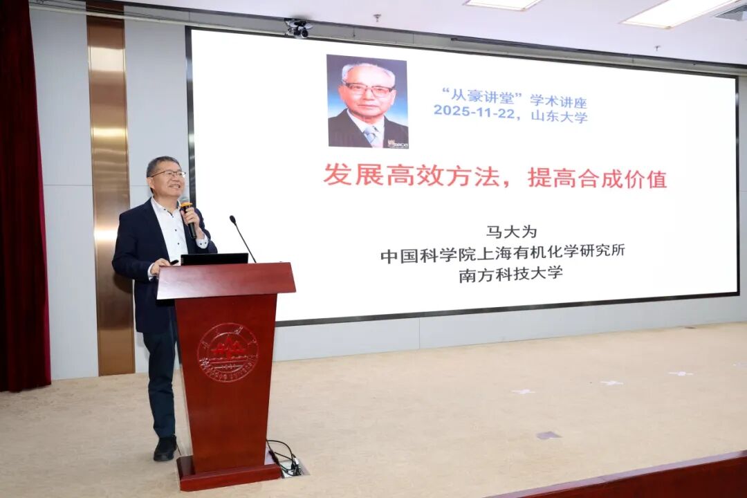 2025年11月22日,山东大学首届“邓从豪奖”颁奖典礼环节结束后,“从豪讲堂”开讲。中国科学院上海有机化学研究所研究员、中国科学院院士、山东大学化学与化工学院1980级校友马大为以《发展高效方法,提高合成价值》为题,与师生展开深度交流。针对人工智能热潮下的科研方向选择、长期坐“冷板凳”等青年学者关切的问题,马大为院士给出了务实建议。他提醒青年学者不要太迷信人工智能在科学研究上的作用,因为“人的跳跃性思维不是靠人工智能的逻辑推导能够实现的。”