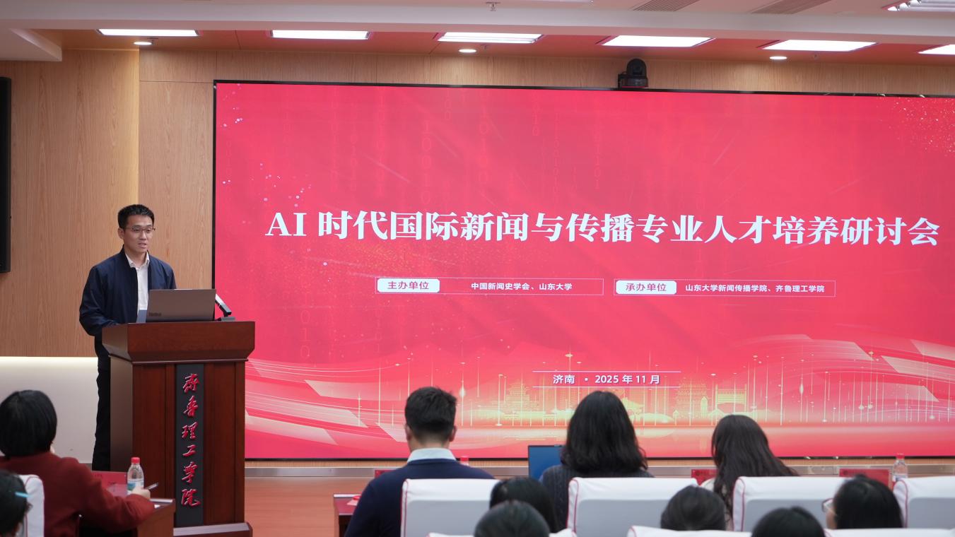 11月28日下午,由山东大学新闻传播学院和齐鲁理工学院联合举办的“AI时代国际新闻与传播专业人才培养研讨会”在齐鲁理工学院举行。学界业界精英共聚一堂,共同探讨AI时代国际新闻与传播人才培养的新路径。全国新文科教育研究中心办公室主任、山东大学本科生院副院长申树欣,山东大学新闻传播学院副院长、教授、博士生导师邱凌,中国新闻社山东分社总编辑李欣等出席论坛,活动由山东大学新闻传播学院院长助理、副教授、博士生导师于智源主持;国内部分高校的师生和山东大学国际新闻与传播专业的全体本科生参加了该论坛。
