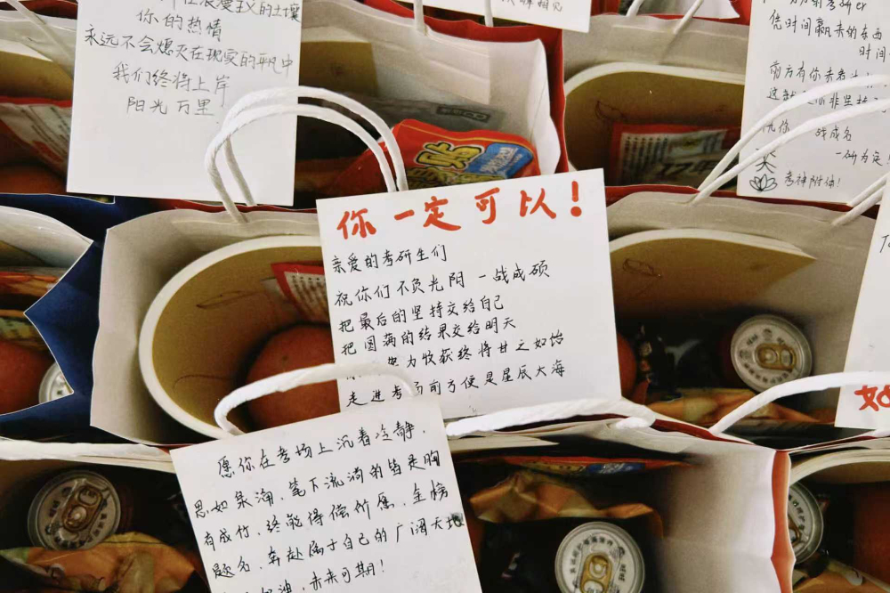 此外,学院还在“上岸茶铺”为考研学子准备了“上岸福袋”和专属祝福,“上岸福袋”里有蒸汽眼罩、暖宝宝、牛奶、橙子、巧克力等,通过这些具有美好寓意的物品,传递学院对学子们的深切期望与鼓励。