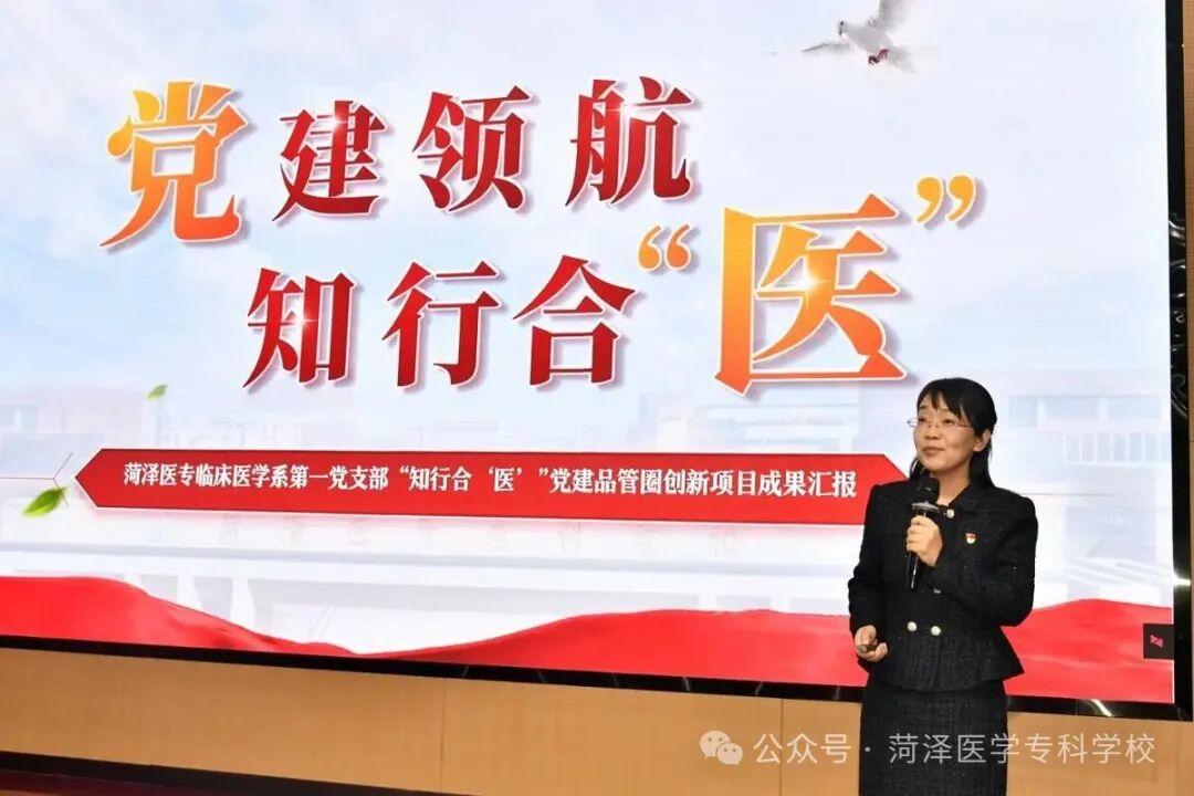 12月2日,在项目展示和颁奖环节,菏泽医专临床医学系第一党支部“知行合医”圈作为优秀项目进行现场展示。党支部书记、项目负责人吴琪同志作为汇报人,以饱满的精神状态、稳健的台风和扎实的专业功底,从主题设计、目标设定、对策实施、效果确认、检讨改进等方面充分展示了支部运用“党建品管圈”管理工具在党建与业务深度融合方面取得的优秀成果,赢得现场领导及同仁的一致好评。