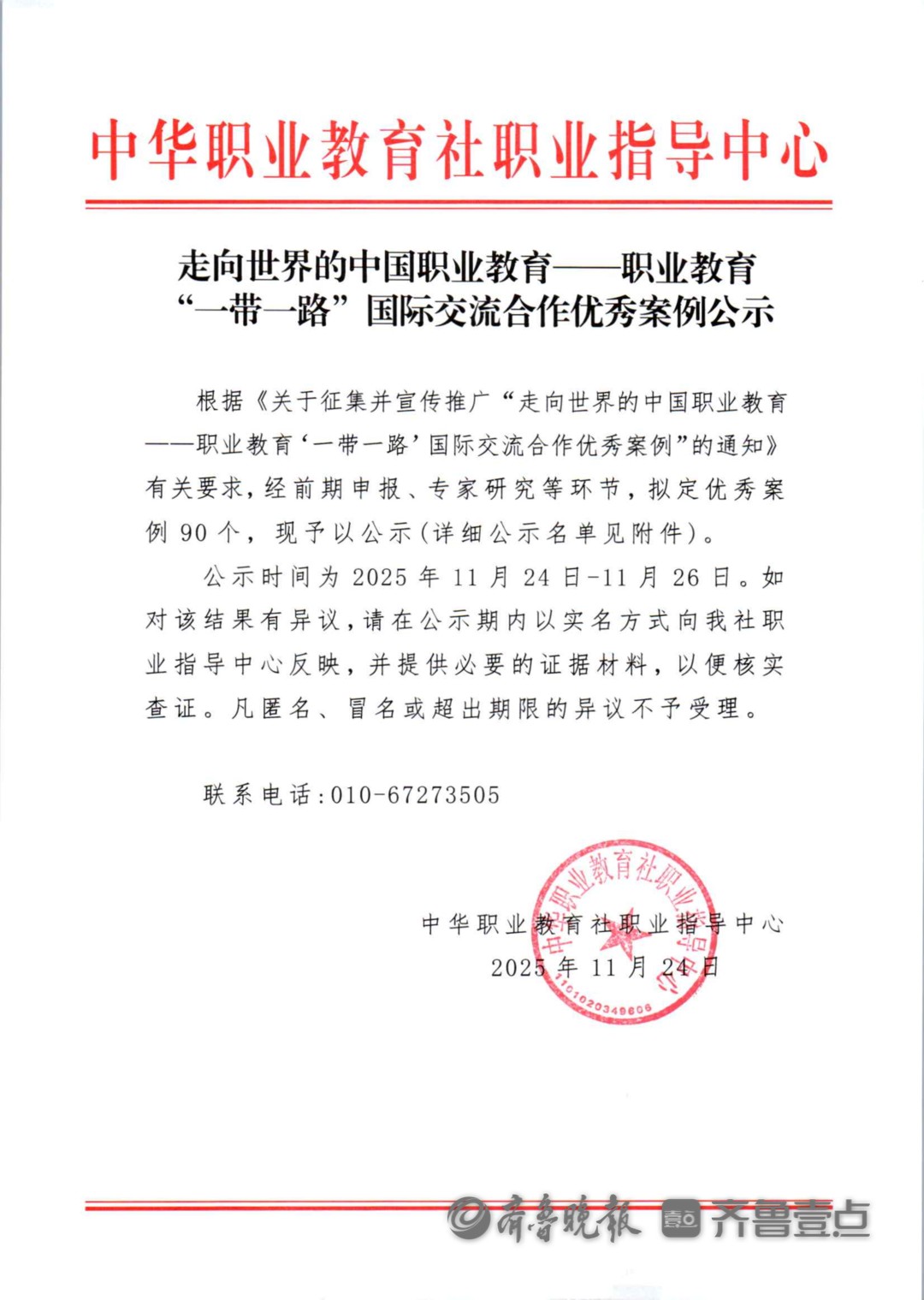 近日,中华职业教育社职业指导中心发布《走向世界的中国职业教育——职业教育“一带一路”国际交流合作优秀案例公示》,《枣庄职业学院“四行”模式打造职教出海2.0构建国际化职教新生态》案例,凭借全要素输出、政校企深度协同的特色实践,荣获优秀案例。
