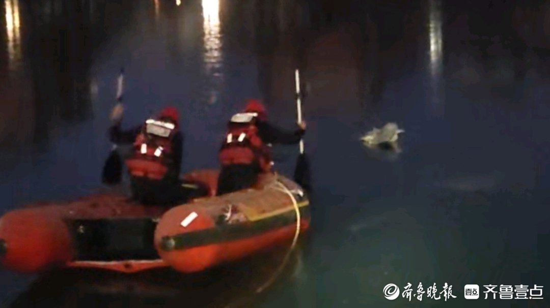消防救援人员小心地将苍鹭周围的薄冰去除,然后将其轻轻抱起,避免二次伤害。随后,岸上的消防救援人员慢慢地拉动救援绳索,将橡皮艇拉至岸边。